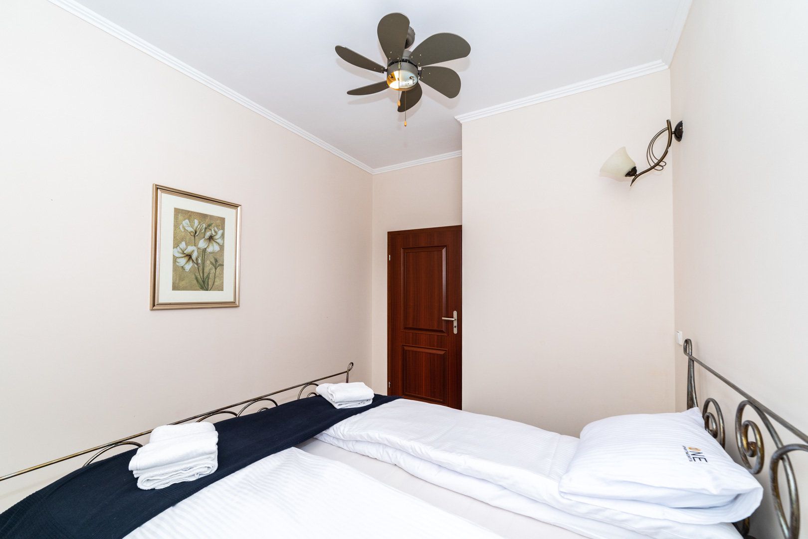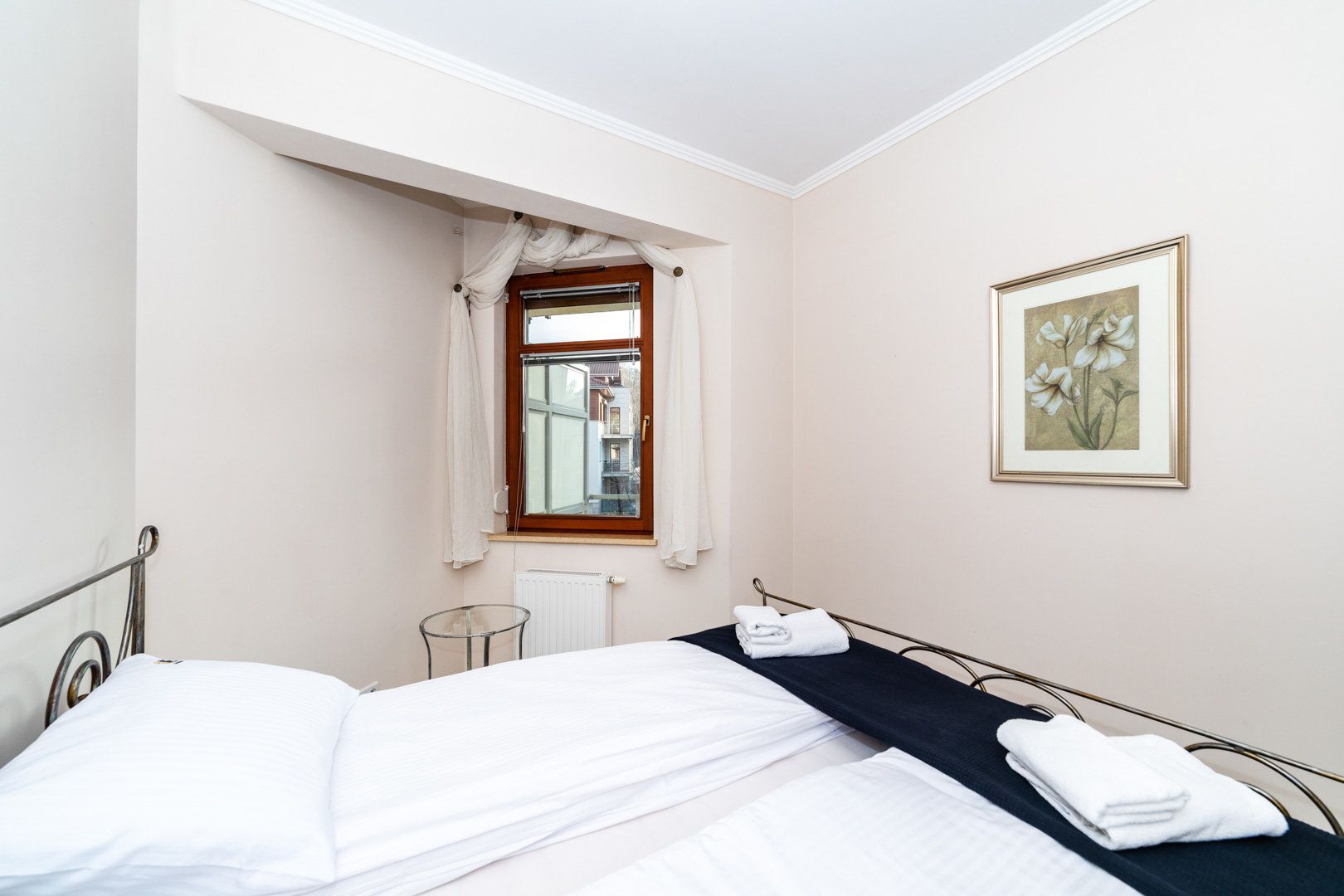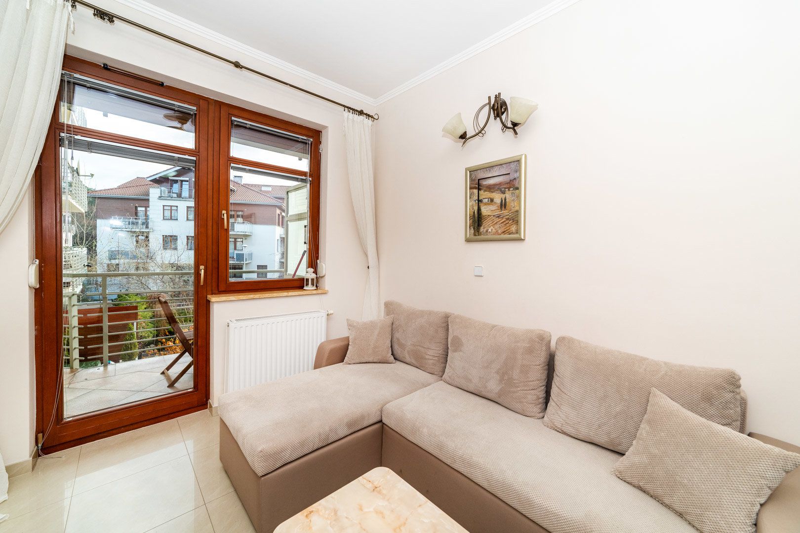 Apartament znajduje się na drugim piętrze i oferuje komfortowy nocleg dla 4 osób. Składa się z jednej przytulnej sypialni, łazienki oraz przestronnego salonu połączonego z aneksem kuchennym, z którego można wyjść na balkon. W salonie znajduje się rozkładana sofa, zapewniająca dodatkowe miejsca do spania.
