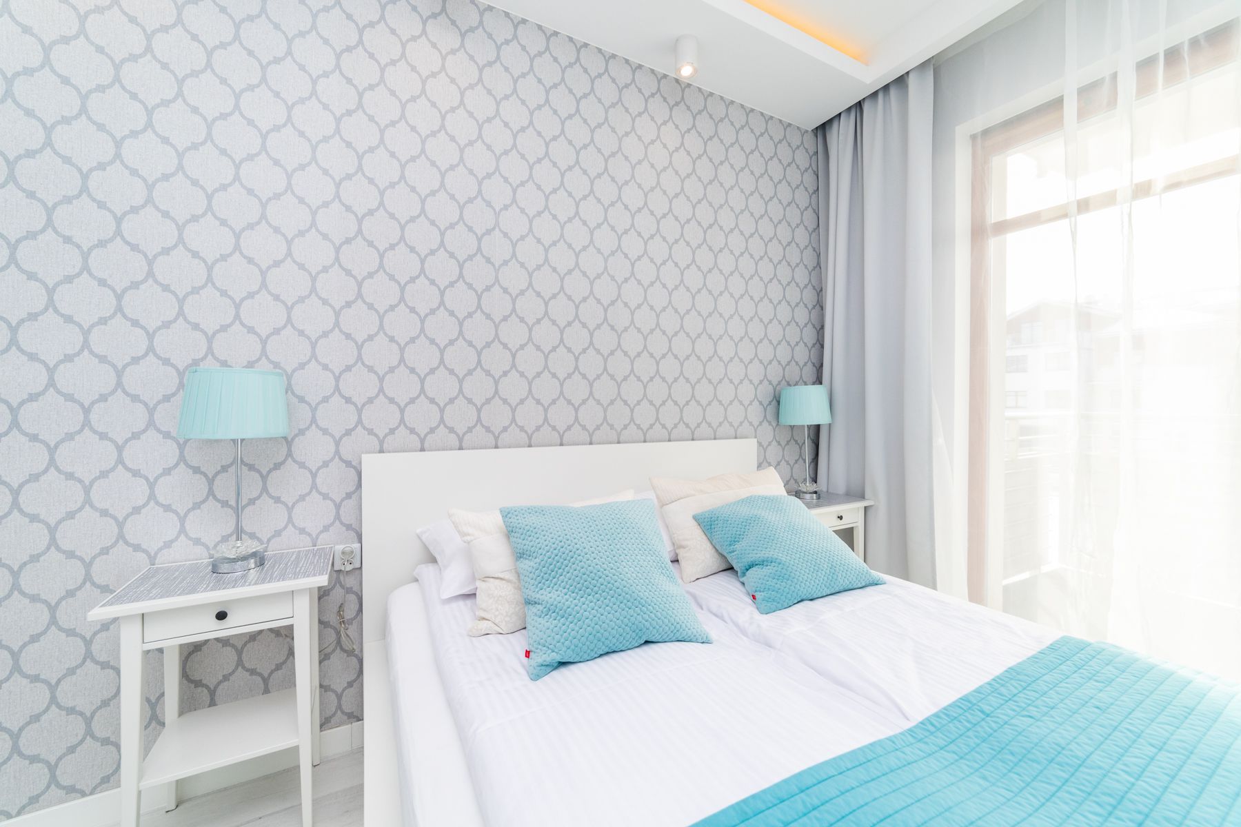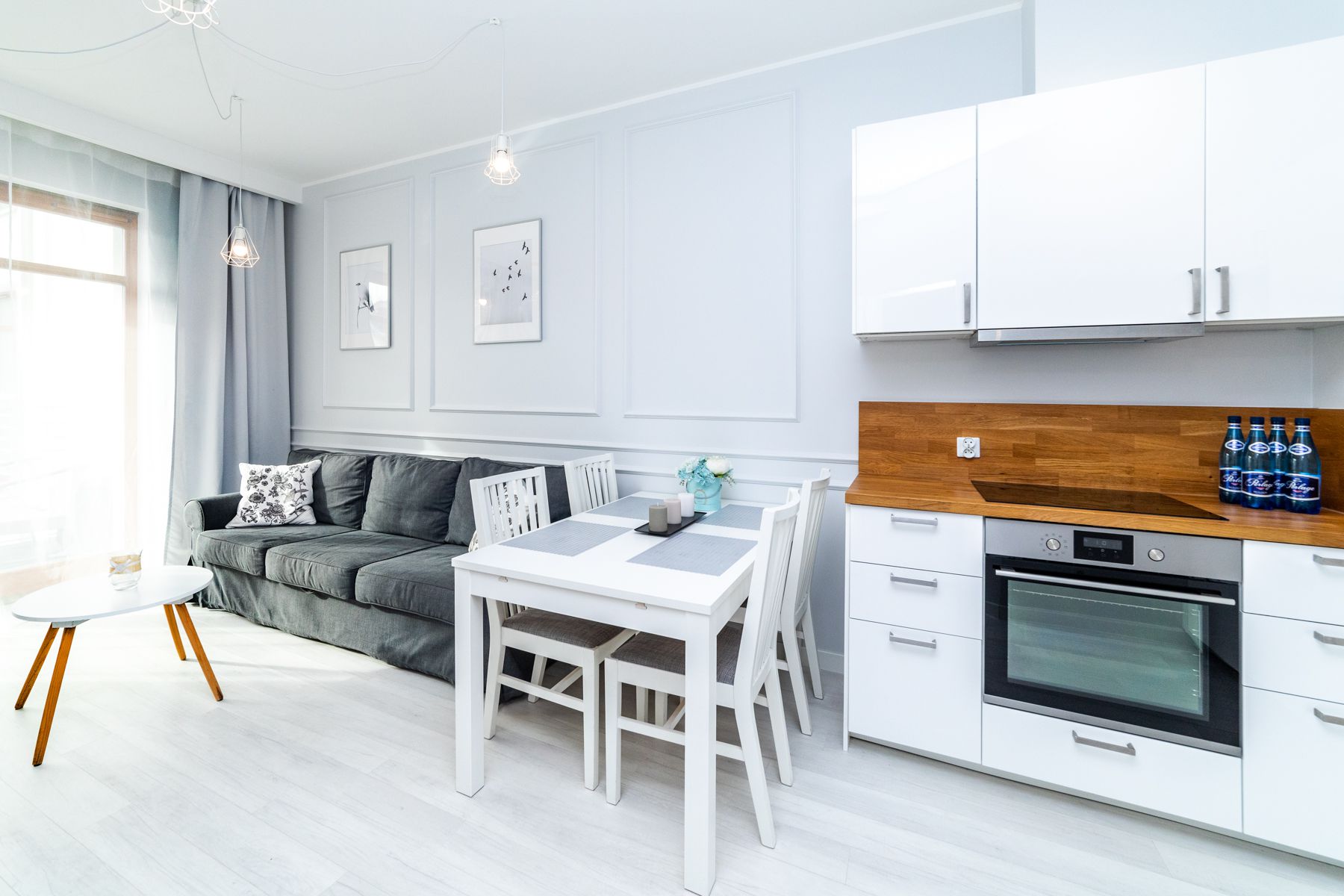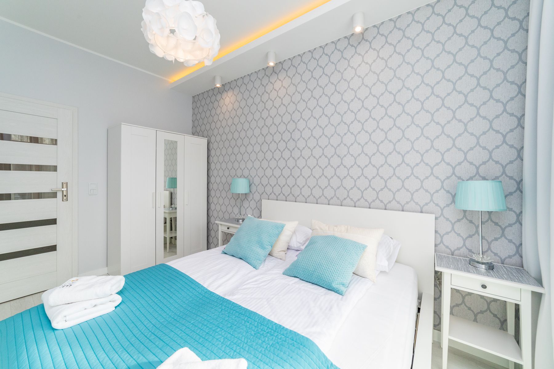 Apartament 4 osobowy o powierzchni 43m2. Składa się z salonu z dobrze wyposażonym aneksem kuchennym, sypialni z łóżkiem małżeńskim oraz łazienki z prysznicem i pralką. W salonie umieszczona jest rozkładana kanapa. Apartament znajduje się na 2 piętrze w budynku z windą. W obiekcie mogą przebywać zwierzęta za dodatkową opłatą. Do apartamentu przypisane jest miejsce parkingowe w hali garażowej.