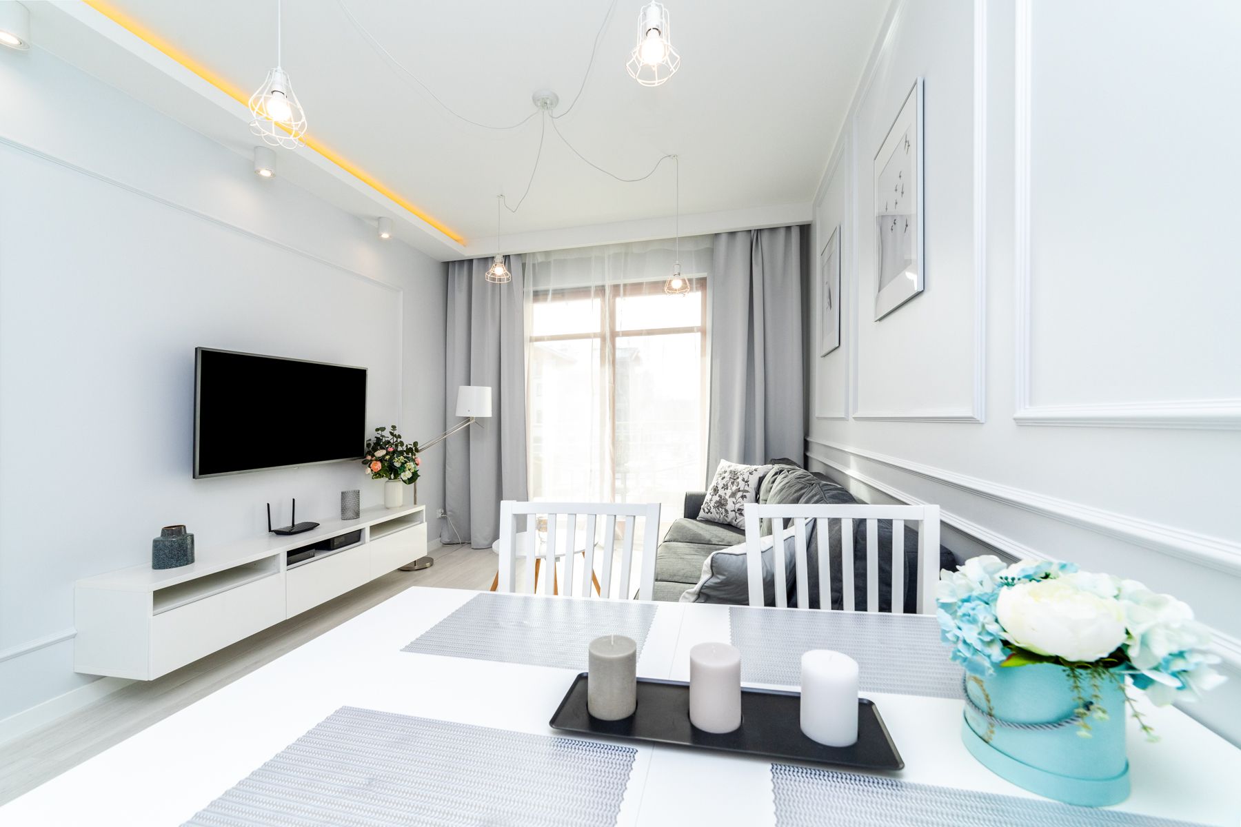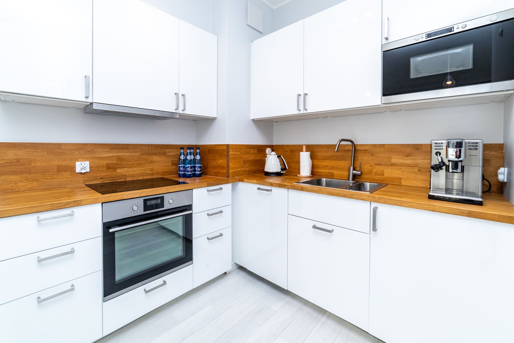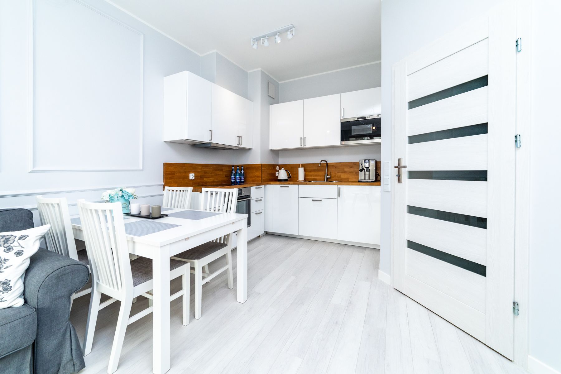 Apartament 4 osobowy o powierzchni 43m2. Składa się z salonu z dobrze wyposażonym aneksem kuchennym, sypialni z łóżkiem małżeńskim oraz łazienki z prysznicem i pralką. W salonie umieszczona jest rozkładana kanapa. Apartament znajduje się na 2 piętrze w budynku z windą. W obiekcie mogą przebywać zwierzęta za dodatkową opłatą. Do apartamentu przypisane jest miejsce parkingowe w hali garażowej.