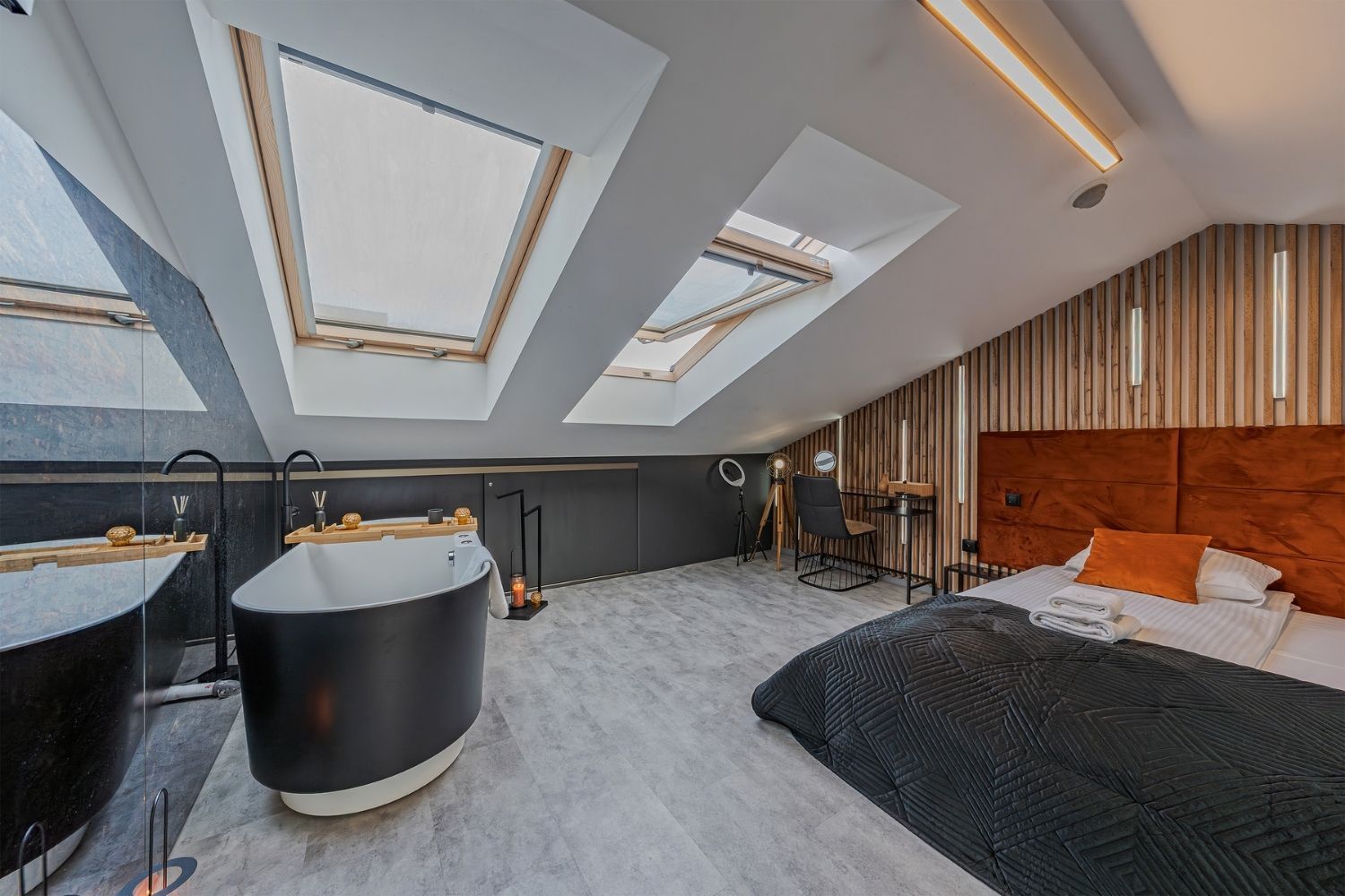 Na gości czeka przestronny salon z aneksem kuchennym, łazienka z prysznicem i prywatną sauną, a także otwarta sypialnia na antresoli. Dodatkowym atutem apartamentu jest wanna z oświetleniem LED, idealna do relaksu po dniu spędzonym na plaży lub wieczornych spacerach po Sopocie. Duże okna dachowe wypełniają wnętrze naturalnym światłem, podkreślając jego przytulny charakter.