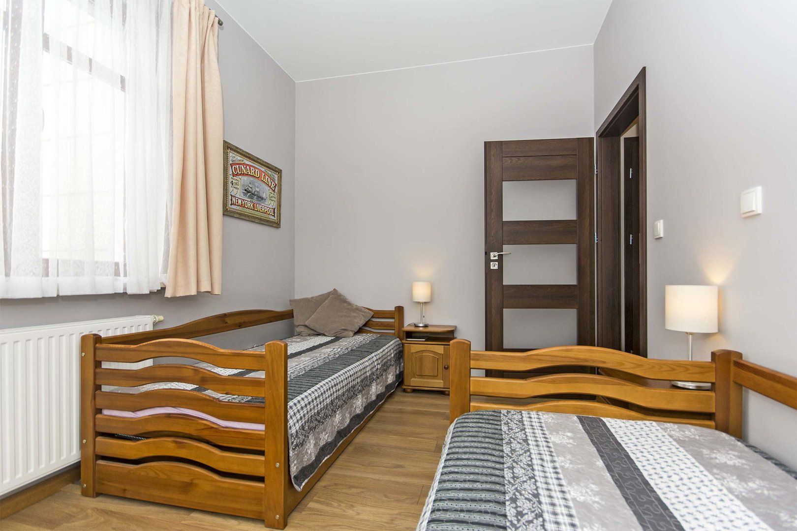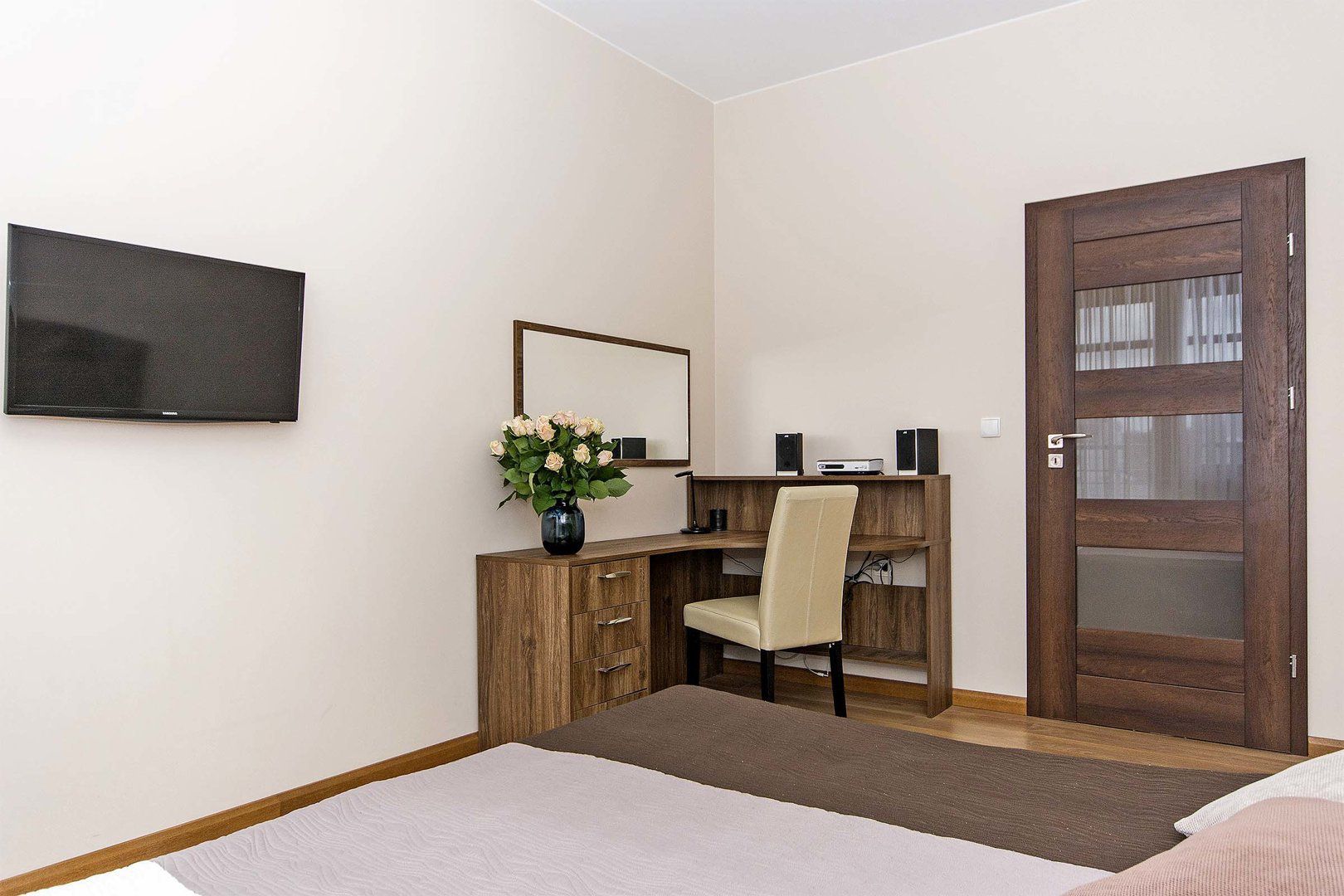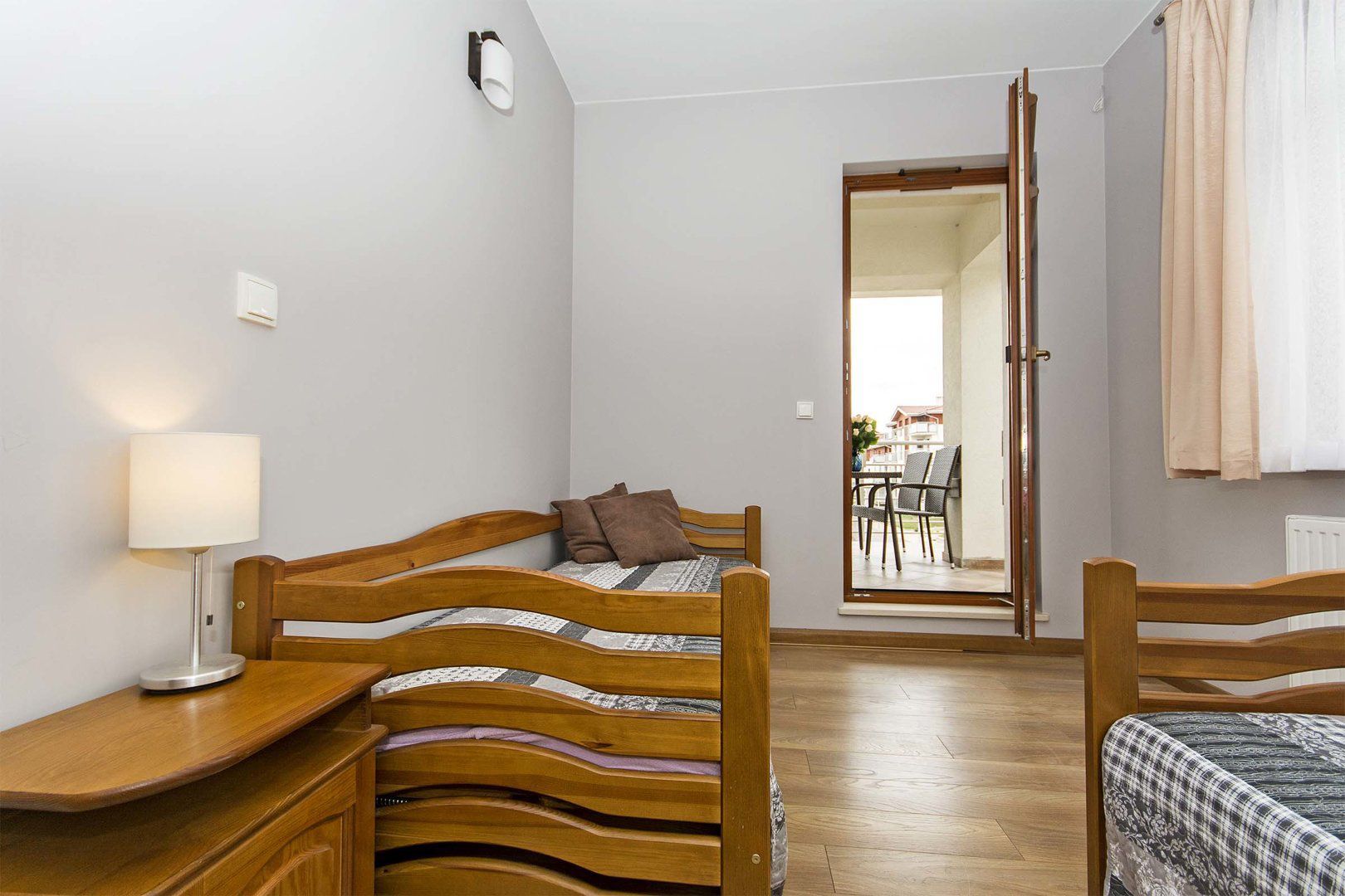 Apartament umieszczony jest na drugim piętrze. Składa się z dwóch sypialni, łazienki z WC oraz salonu połączonego z aneksem kuchennym, z którego istnieje wyjście na słoneczny taras.