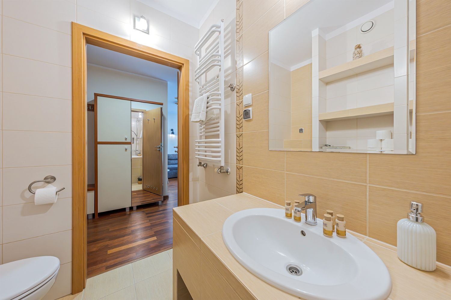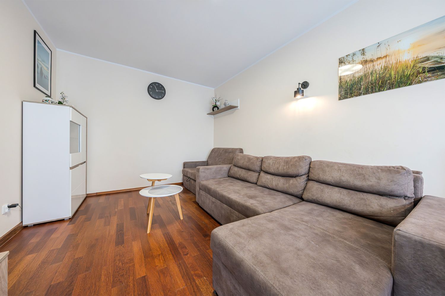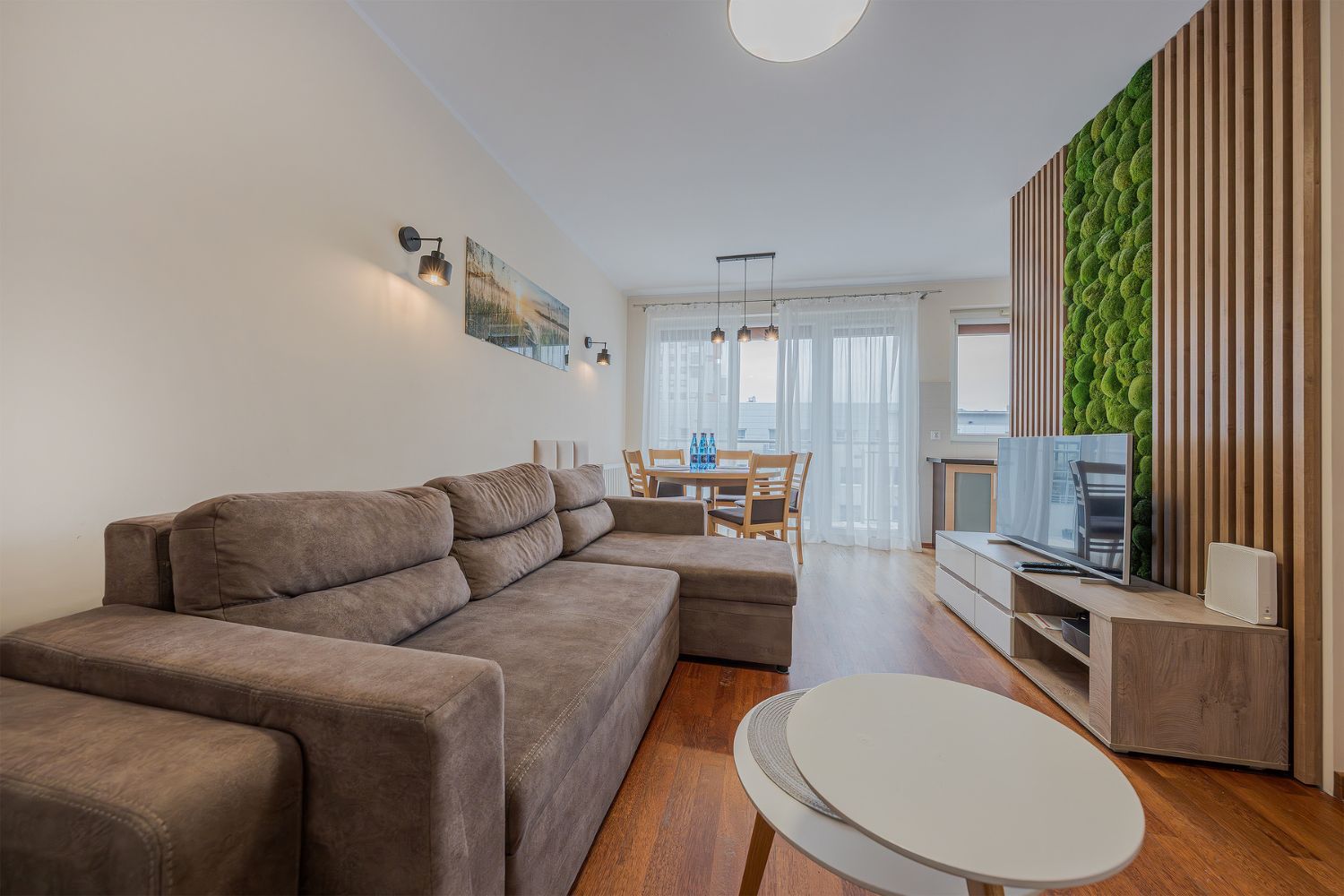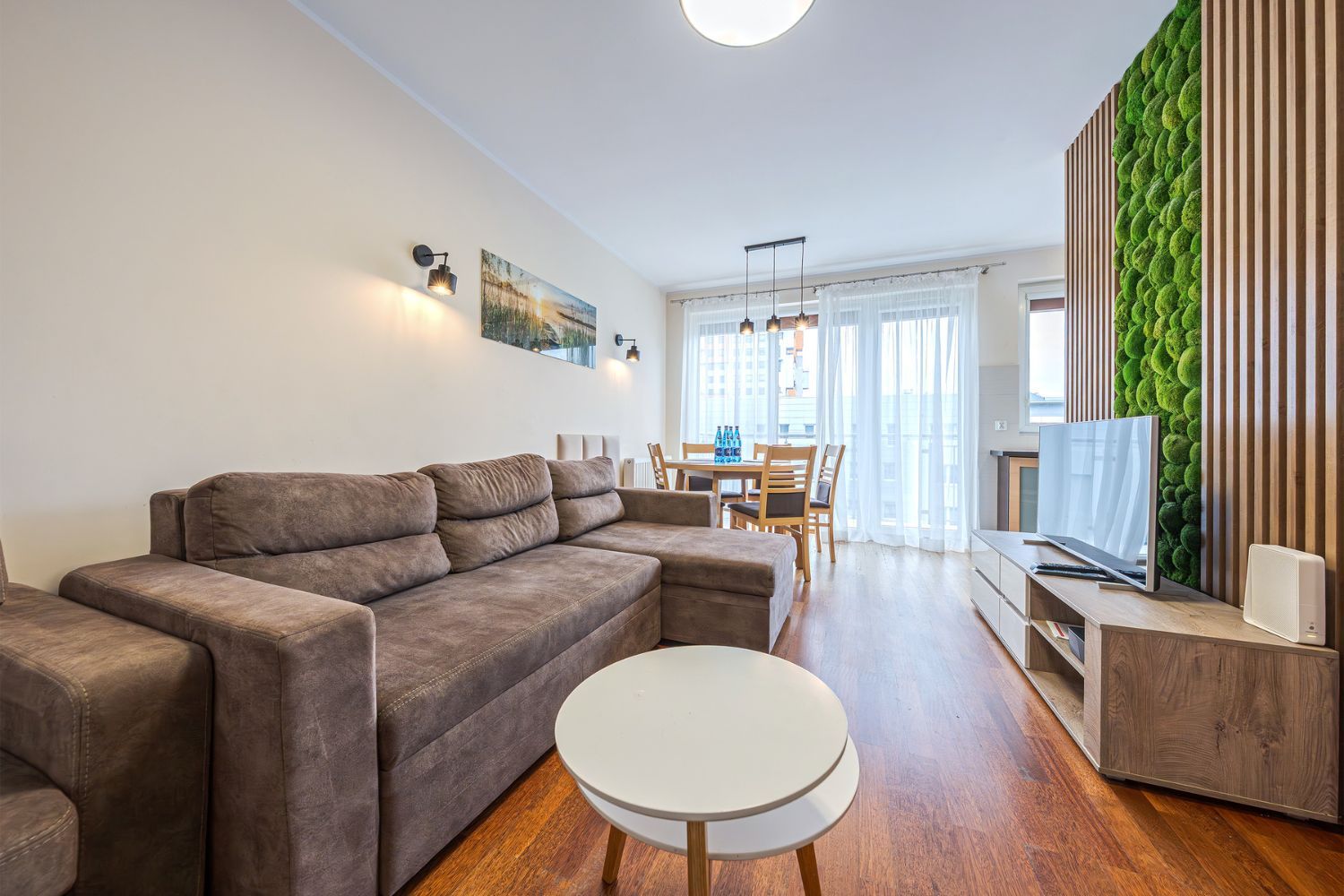 Apartament składa się z przestronnego salonu połączonego z jadalnią, oddzielnej sypialni, funkcjonalnego aneksu kuchennego oraz nowoczesnej łazienki. W części dziennej znajduje się wygodna rozkładana sofa, telewizor z płaskim ekranem oraz stół jadalniany z krzesłami. Z salonu prowadzi wyjście na balkon, który stanowi dodatkową przestrzeń do wypoczynku. Duże okna zapewniają dobre doświetlenie wnętrza przez cały dzień.