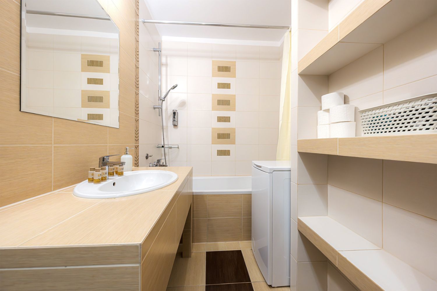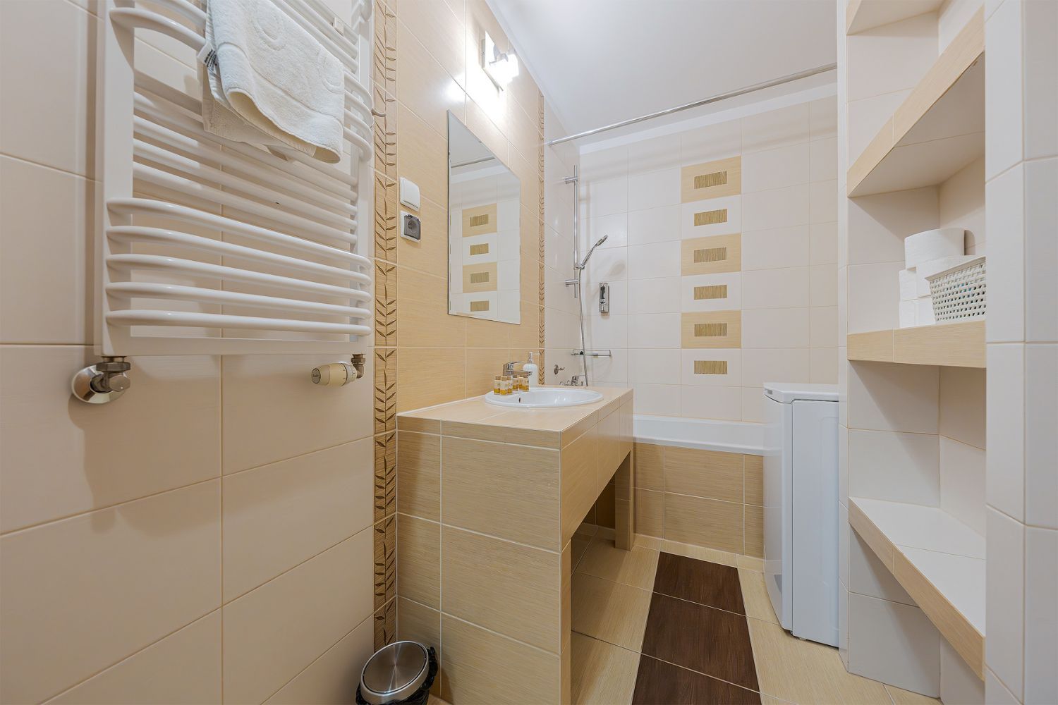 Sypialnia wyposażona została w komfortowe łóżko z wysokiej jakości materacem, oświetlenie sprzyjające odpoczynkowi oraz miejsce do przechowywania. Łazienka oferuje wannę z funkcją prysznica, umywalkę z lustrem, pralkę, ręczniki oraz podstawowe kosmetyki. Aneks kuchenny umożliwia samodzielne przygotowywanie posiłków i obejmuje płytę grzewczą, lodówkę, zmywarkę, czajnik elektryczny oraz komplet naczyń i akcesoriów kuchennych.