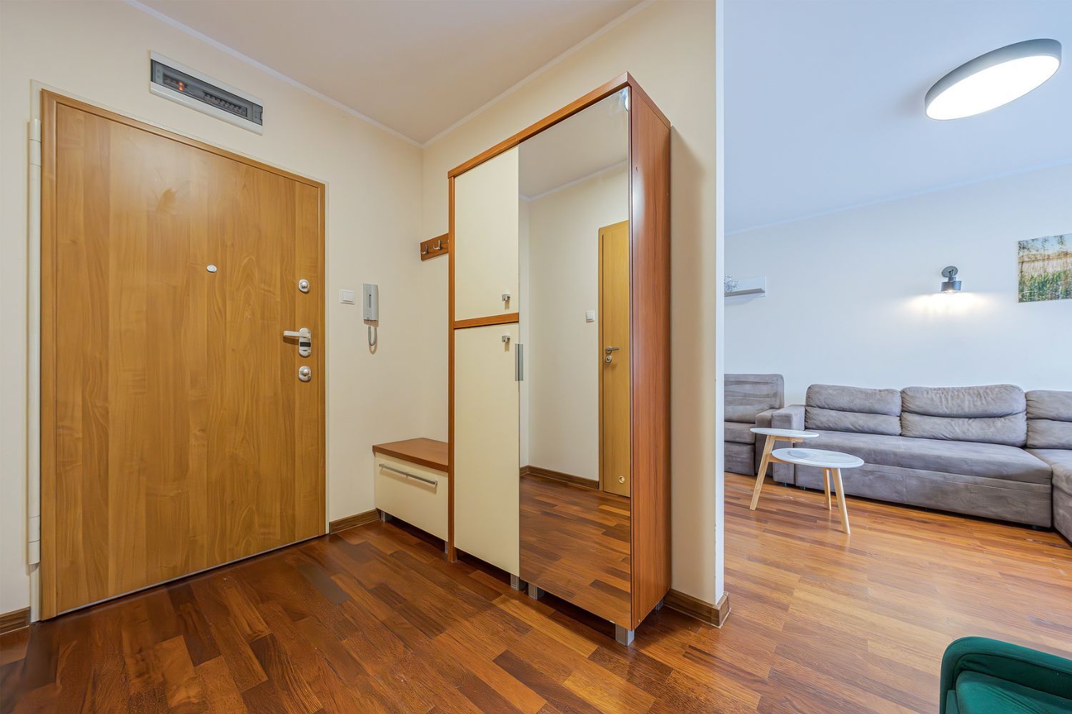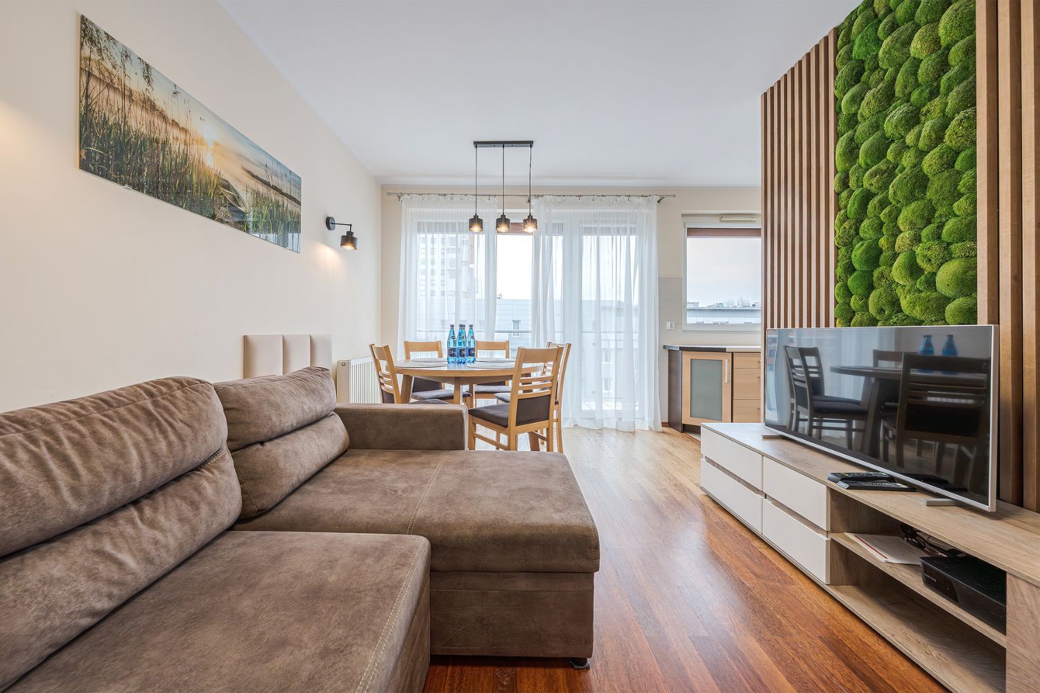 Apartament Greenwall Point by One Apartments to przestrzeń zaprojektowana z myślą o komforcie i funkcjonalności zarówno podczas krótkich, jak i dłuższych pobytów w Gdańsku. Wnętrze utrzymane jest w jasnej, stonowanej kolorystyce z naturalnymi akcentami drewna. Charakterystycznym elementem apartamentu jest zielona ściana z mchu, która nadaje wnętrzu spokojny, harmonijny charakter i sprzyja relaksowi.