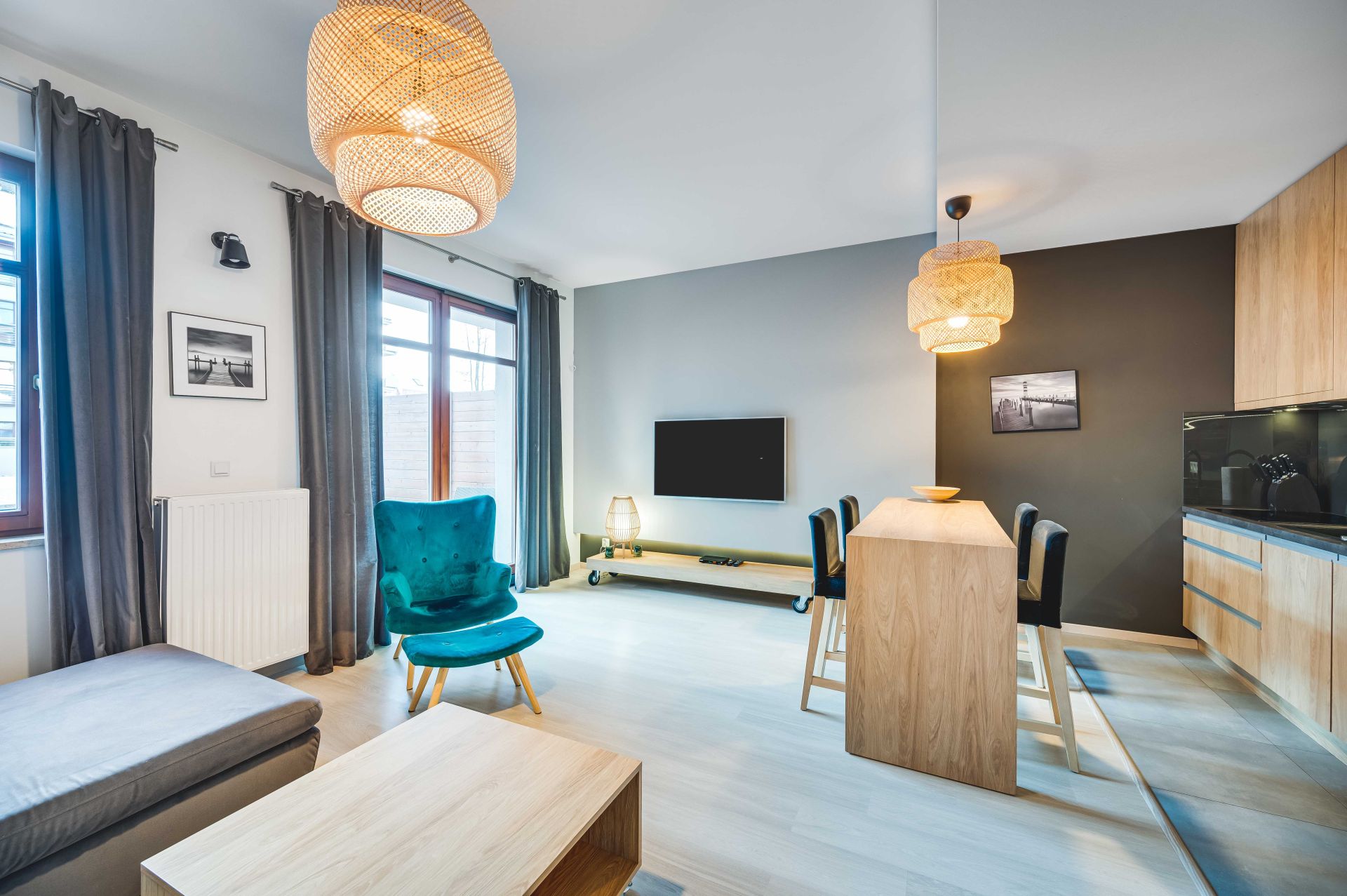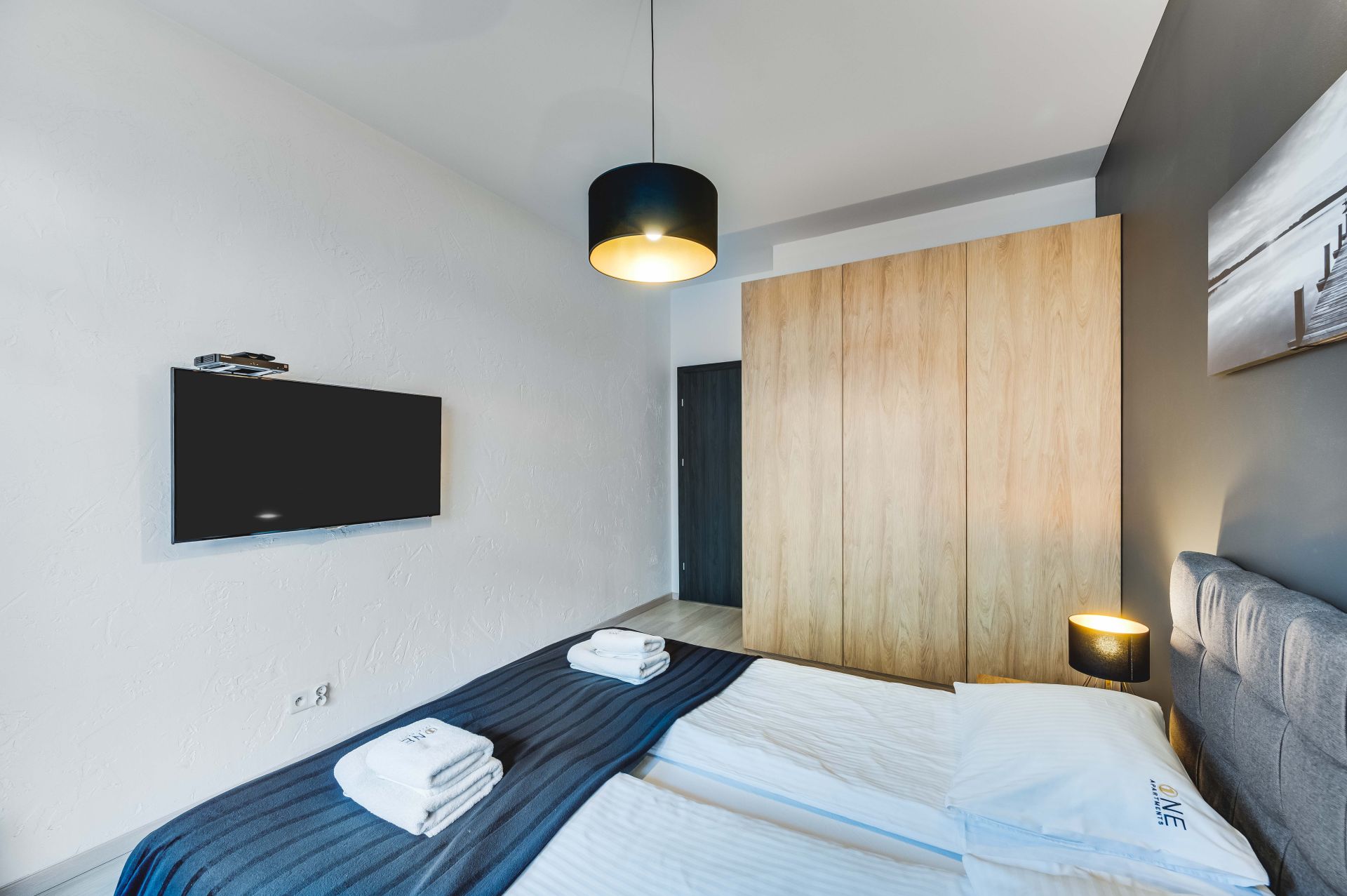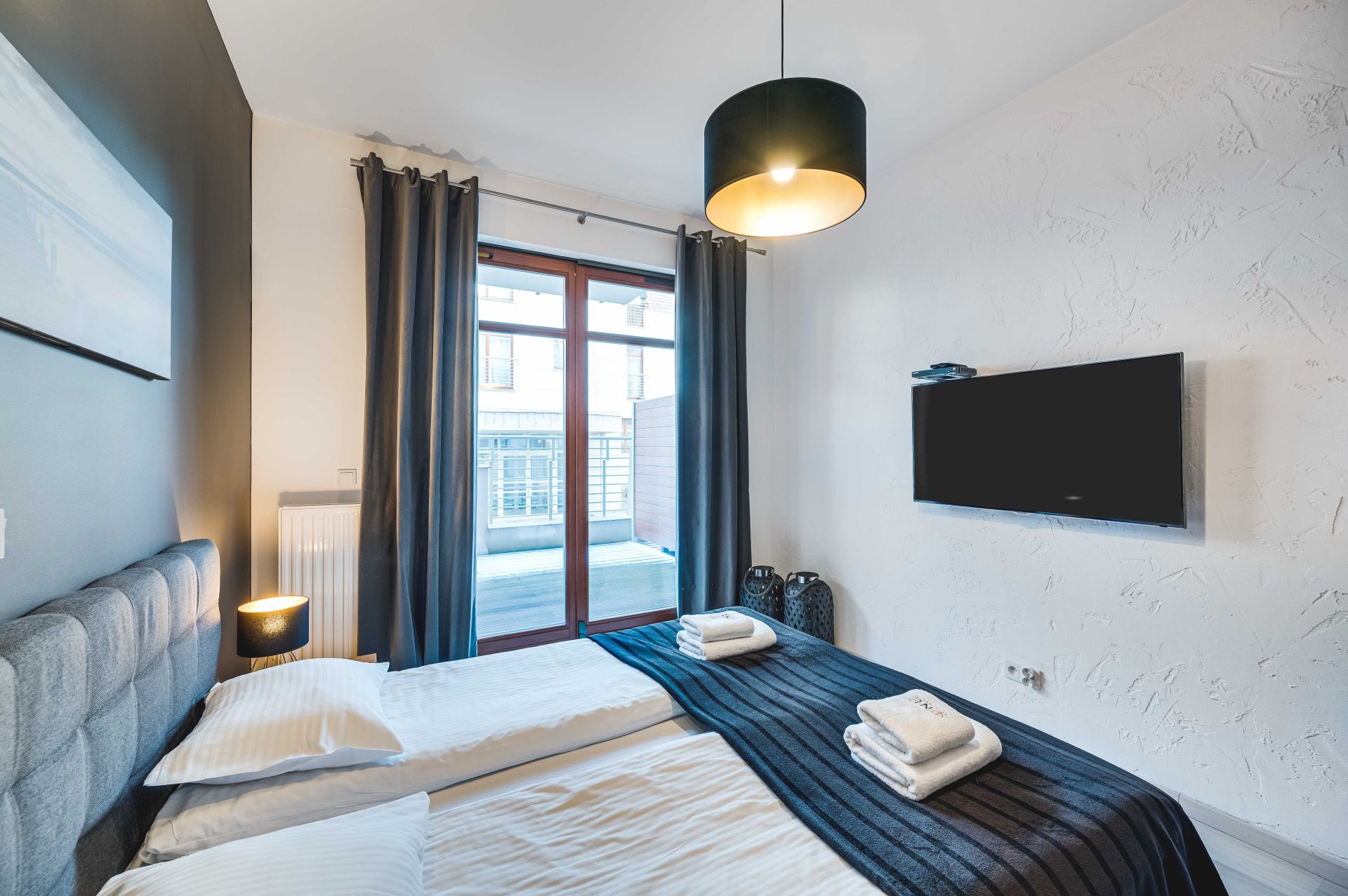 Apartament 4 osobowy o powierzchni 52m2. Składa się z salonu z dobrze wyposażonym aneksem kuchennym, sypialni z łóżkiem małżeńskim oraz łazienki z prysznicem. W salonie umieszczona jest rozkładana sofa. Apartament znajduje się na wysokim parterze w budynku z windą. Dodatkowo w mieszkaniu znajduje się taras. W obiekcie obowiązuje całkowity zakaz pobytu ze zwierzętami. Do apartamentu przypisane jest miejsce parkingowe w hali garażowej.