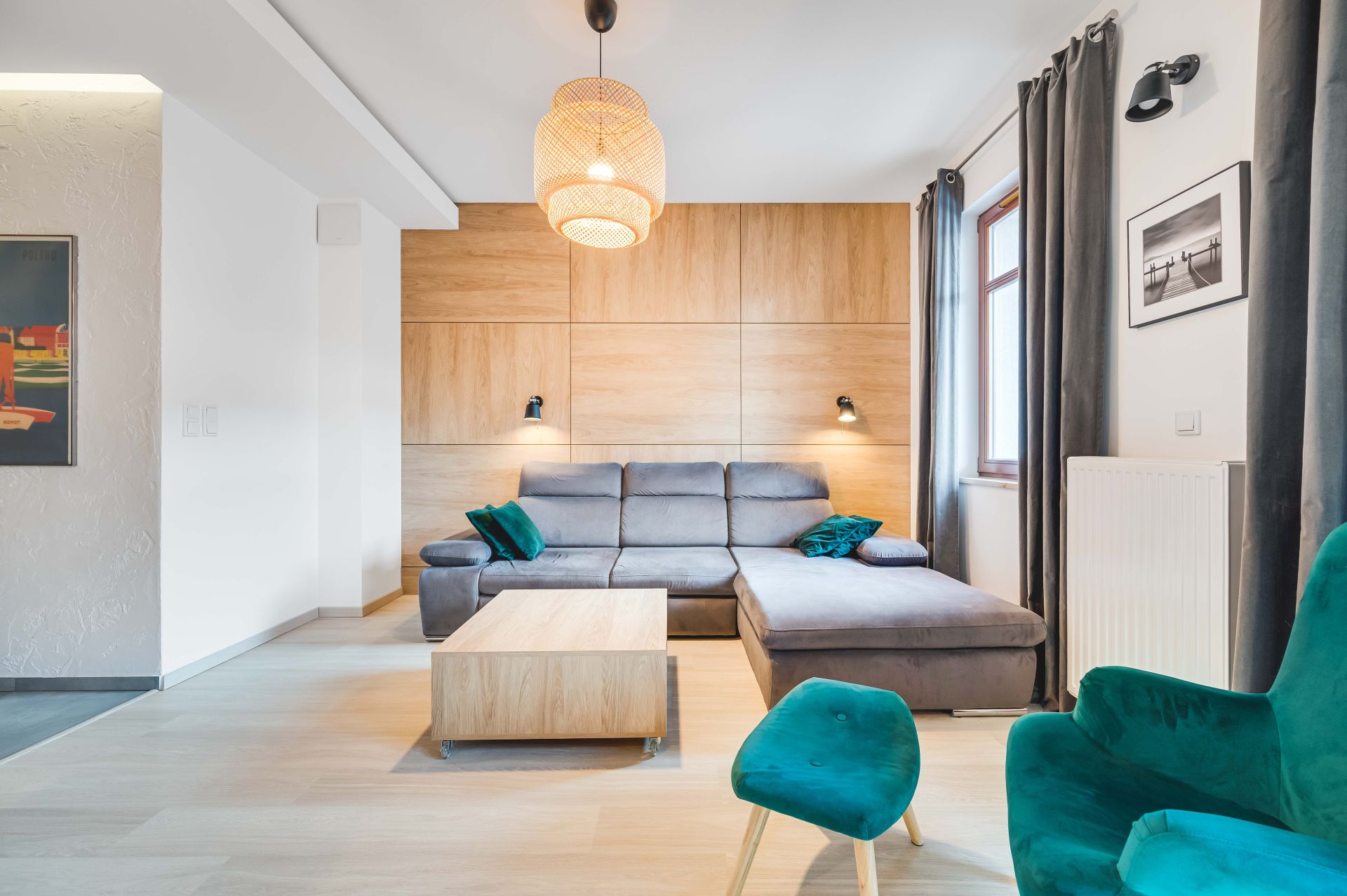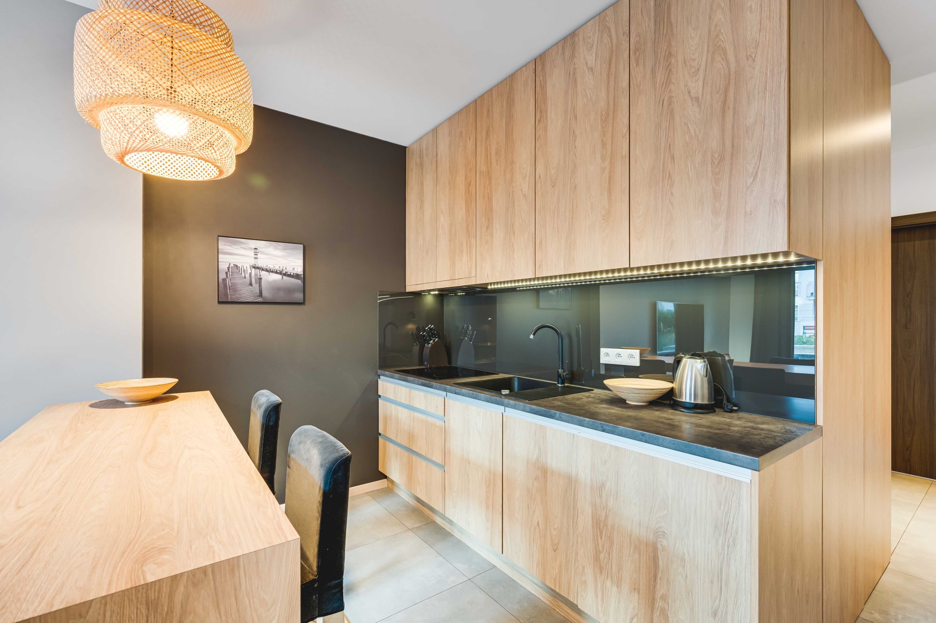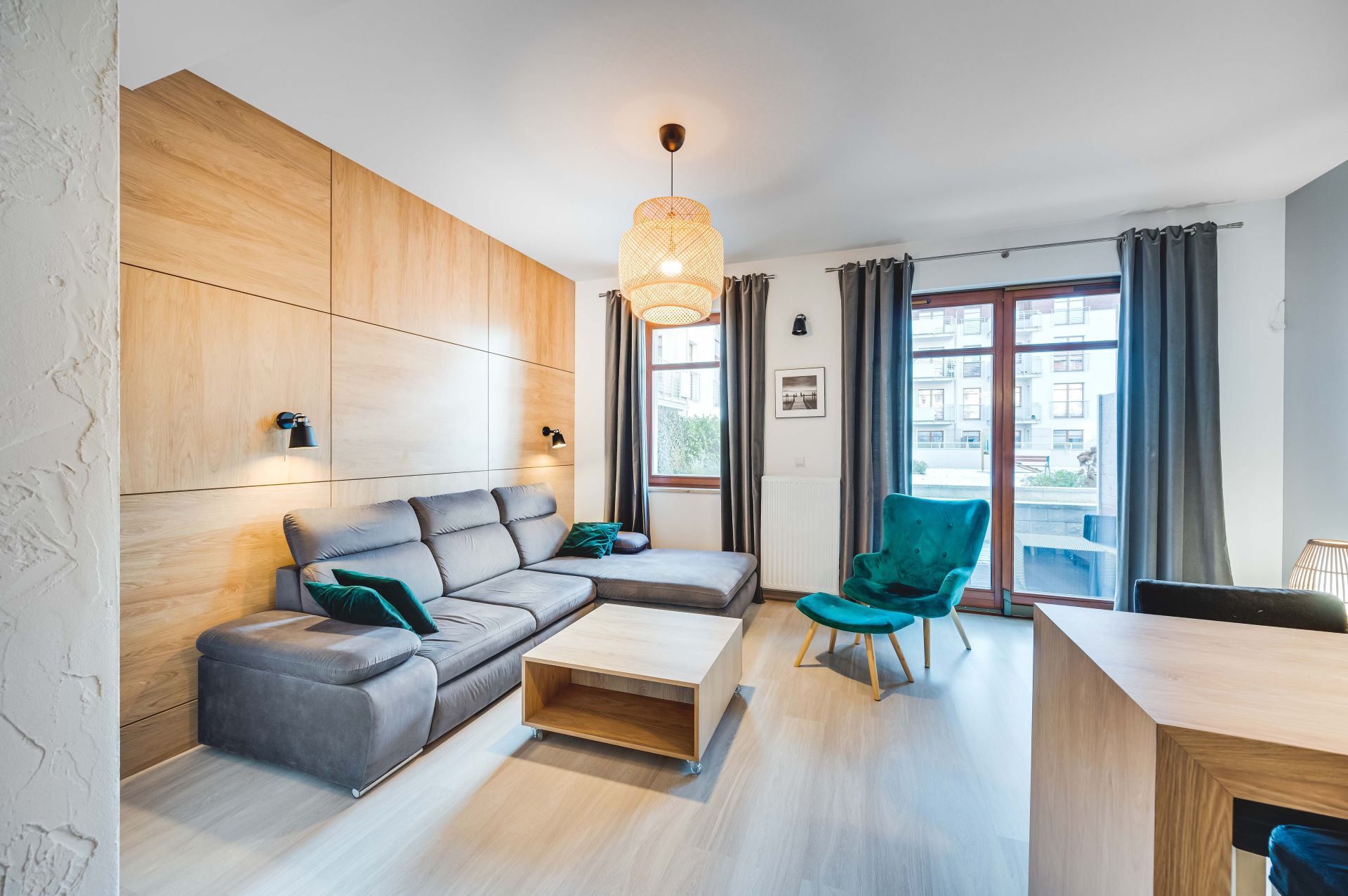 Apartament 4 osobowy o powierzchni 52m2. Składa się z salonu z dobrze wyposażonym aneksem kuchennym, sypialni z łóżkiem małżeńskim oraz łazienki z prysznicem. W salonie umieszczona jest rozkładana sofa. Apartament znajduje się na wysokim parterze w budynku z windą. Dodatkowo w mieszkaniu znajduje się taras. W obiekcie obowiązuje całkowity zakaz pobytu ze zwierzętami. Do apartamentu przypisane jest miejsce parkingowe w hali garażowej.