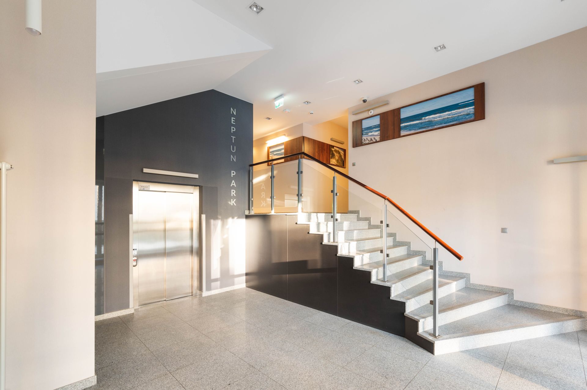 Apartament znajduje się na prestiżowym, zamkniętym osiedlu Neptun Park w Gdańsku Jelitkowie – 100 metrów od plaży. W pobliżu znajduje się Park Reagana który jest idealny do spokojnych spacerów. Dla miłośników bardziej aktywnego wypoczynku w okolicy znajdują się liczne ścieżki rowerowe.