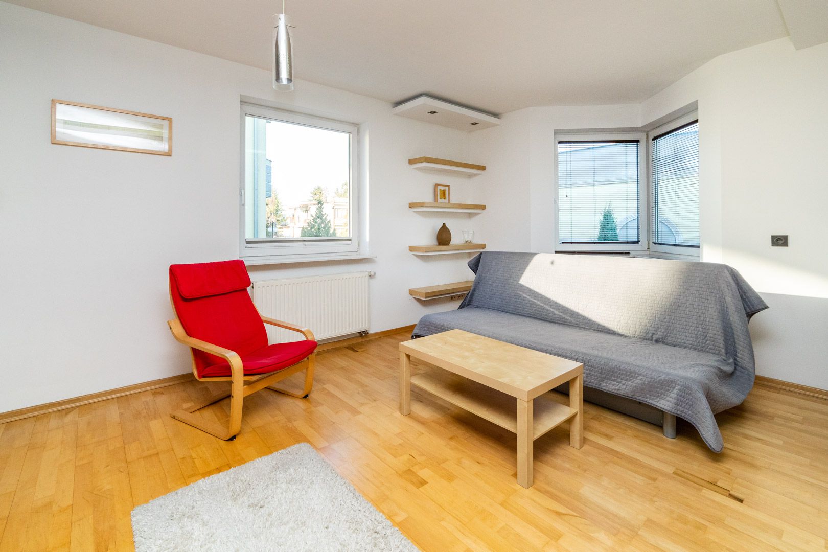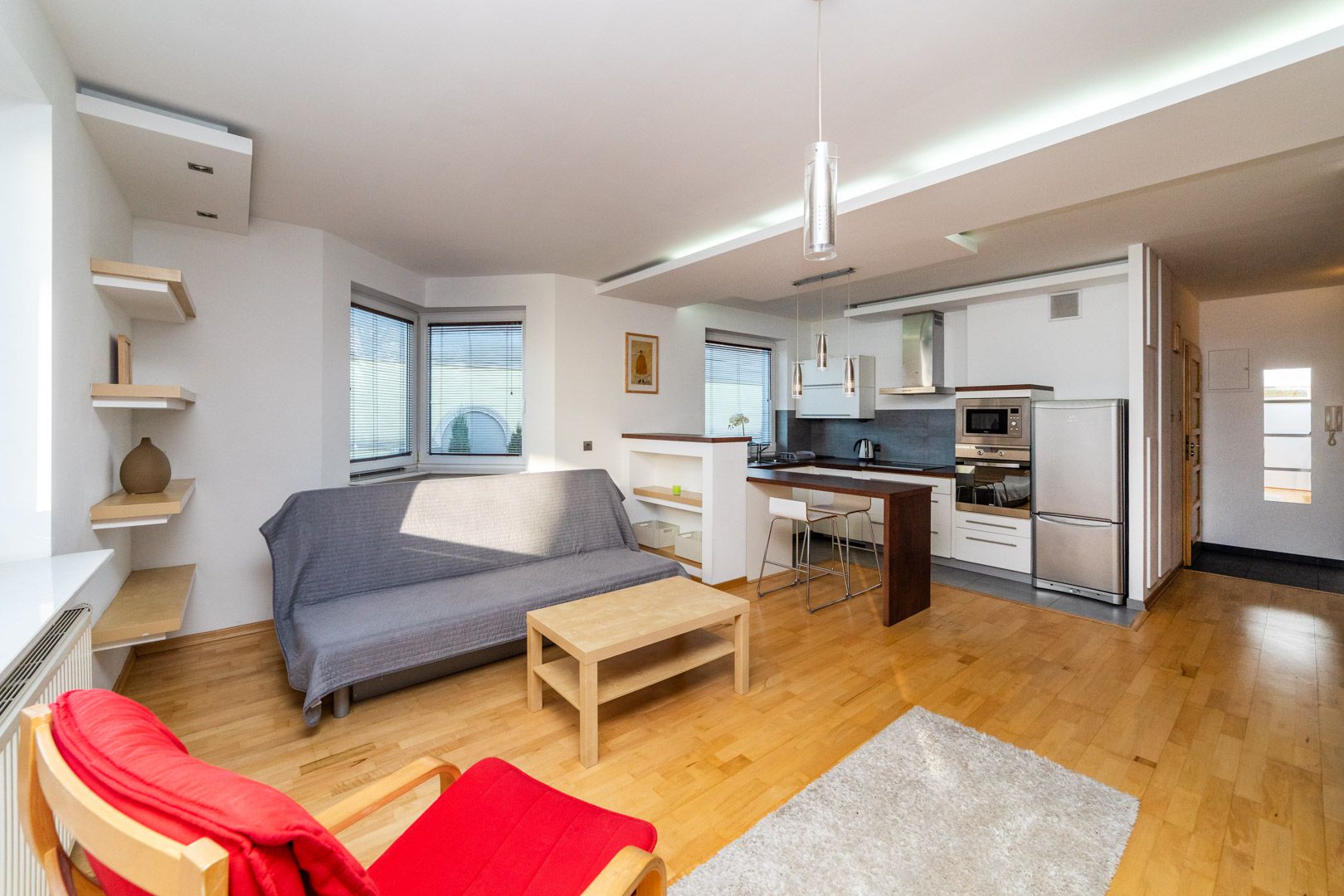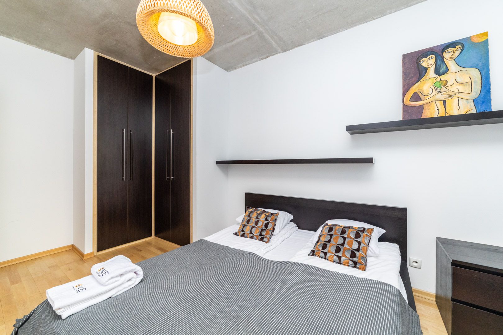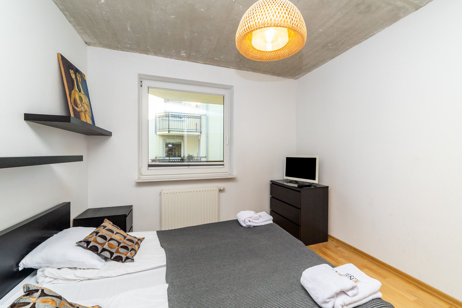 Składa się z jednej sypialni, łazienki z WC oraz salonu połączonego z aneksem kuchennym, z którego istnieje wyjście na balkon. W salonie znajduje się rozkładana sofa.