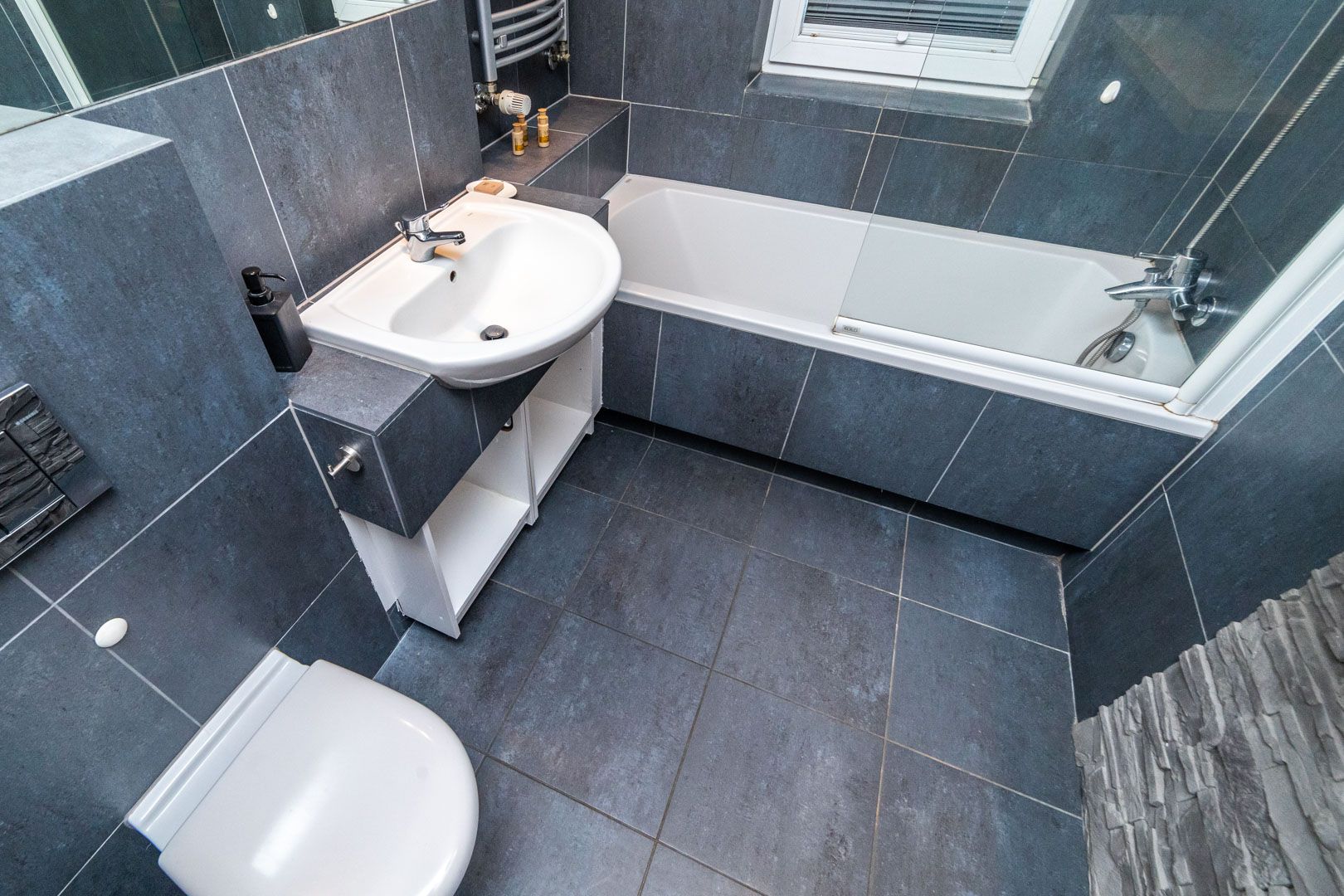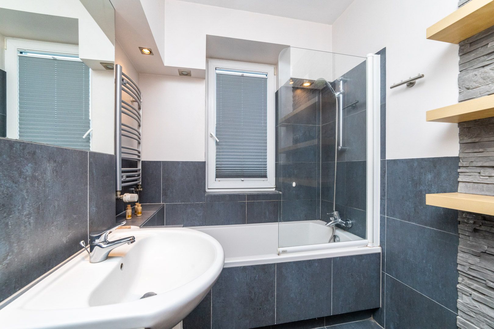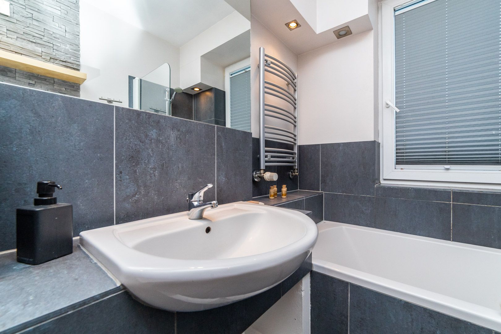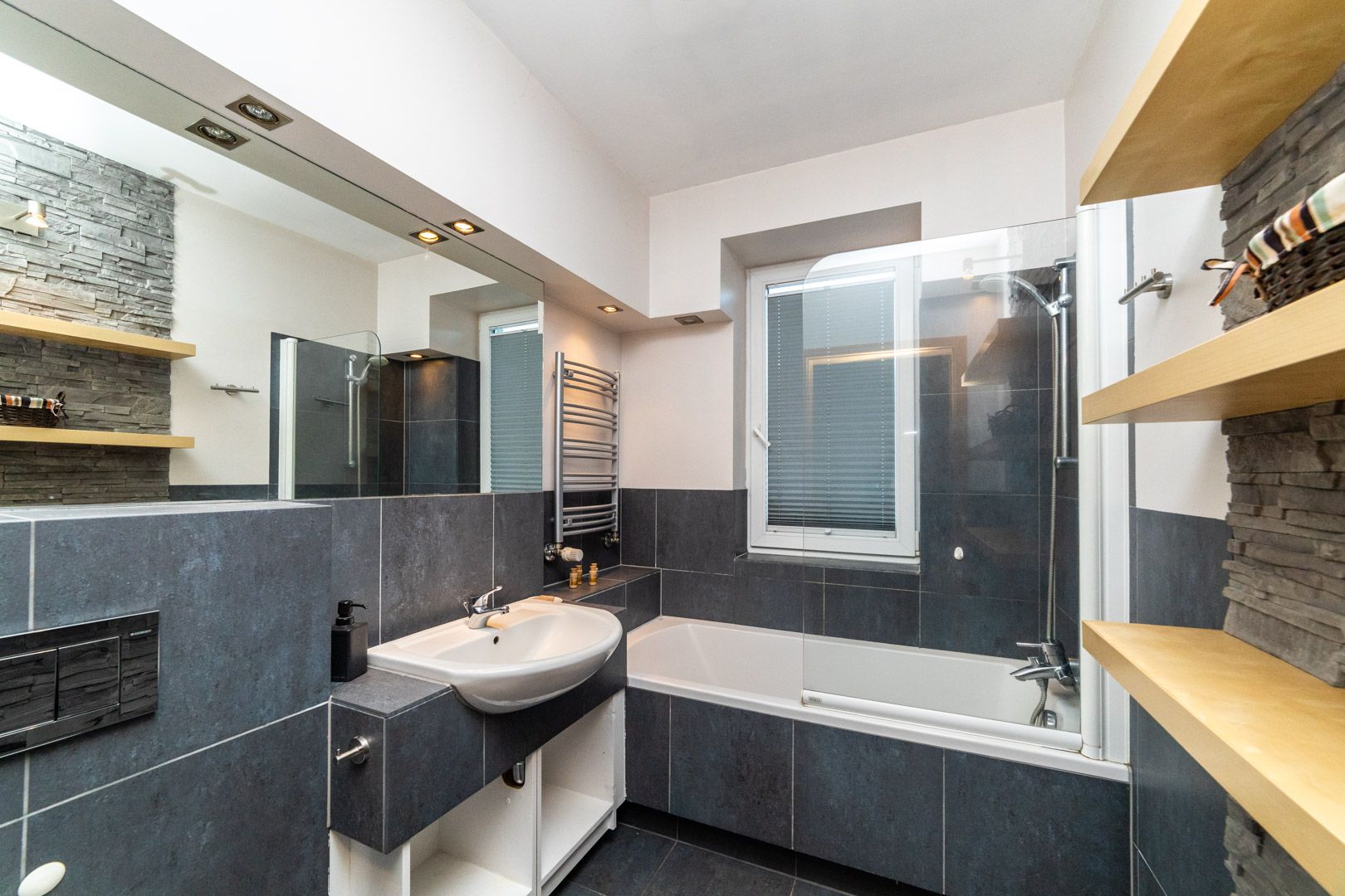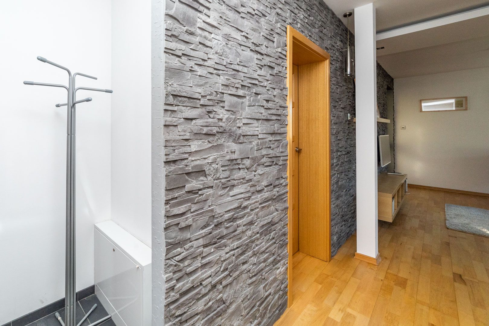 Składa się z jednej sypialni, łazienki z WC oraz salonu połączonego z aneksem kuchennym, z którego istnieje wyjście na balkon. W salonie znajduje się rozkładana sofa.