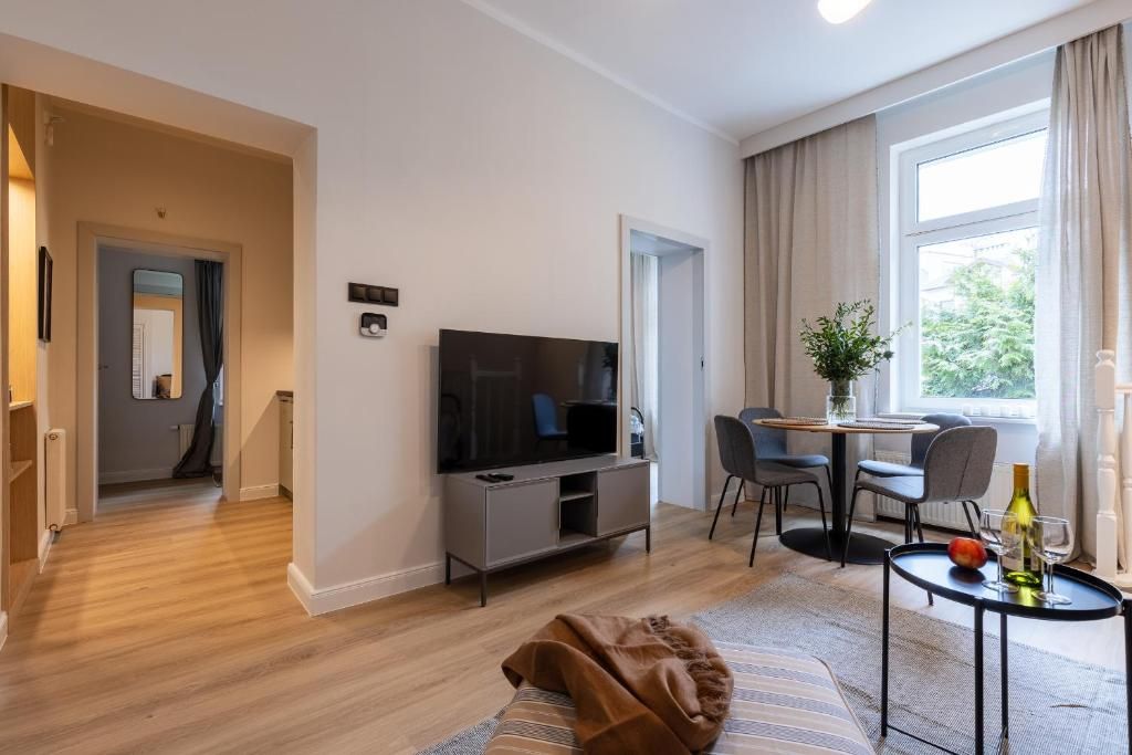 Apartament został urządzony w jasnym, eleganckim stylu i oferuje wygodną przestrzeń do wypoczynku. W skład wnętrza wchodzi komfortowa część dzienna z sofą, telewizorem oraz strefą jadalnianą, a także w pełni wyposażony aneks kuchenny. Goście mają do dyspozycji m.in. płytę grzewczą, lodówkę, czajnik, ekspres do kawy oraz komplet naczyń i sztućców.