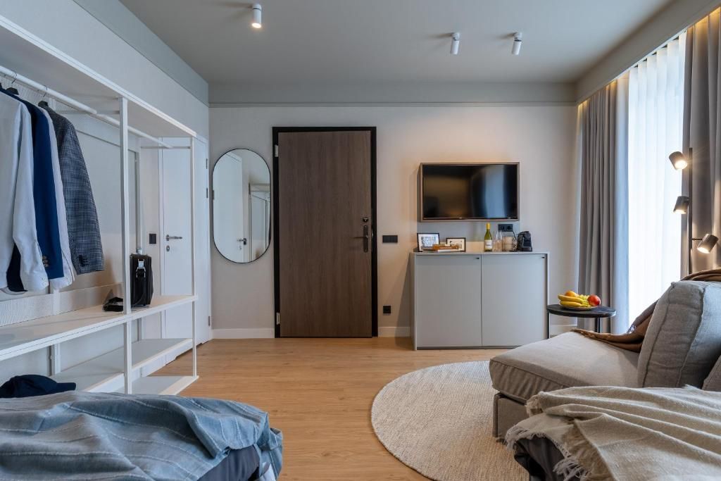 Apartament o powierzchni 26 m² oferuje cały obiekt na wyłączność, zapewniając pełną prywatność i swobodę pobytu. Przestrzeń została wykończona z dbałością o detale – podłoga z naturalnego parkietu, stonowana kolorystyka i funkcjonalny układ tworzą przyjemną atmosferę do wypoczynku.