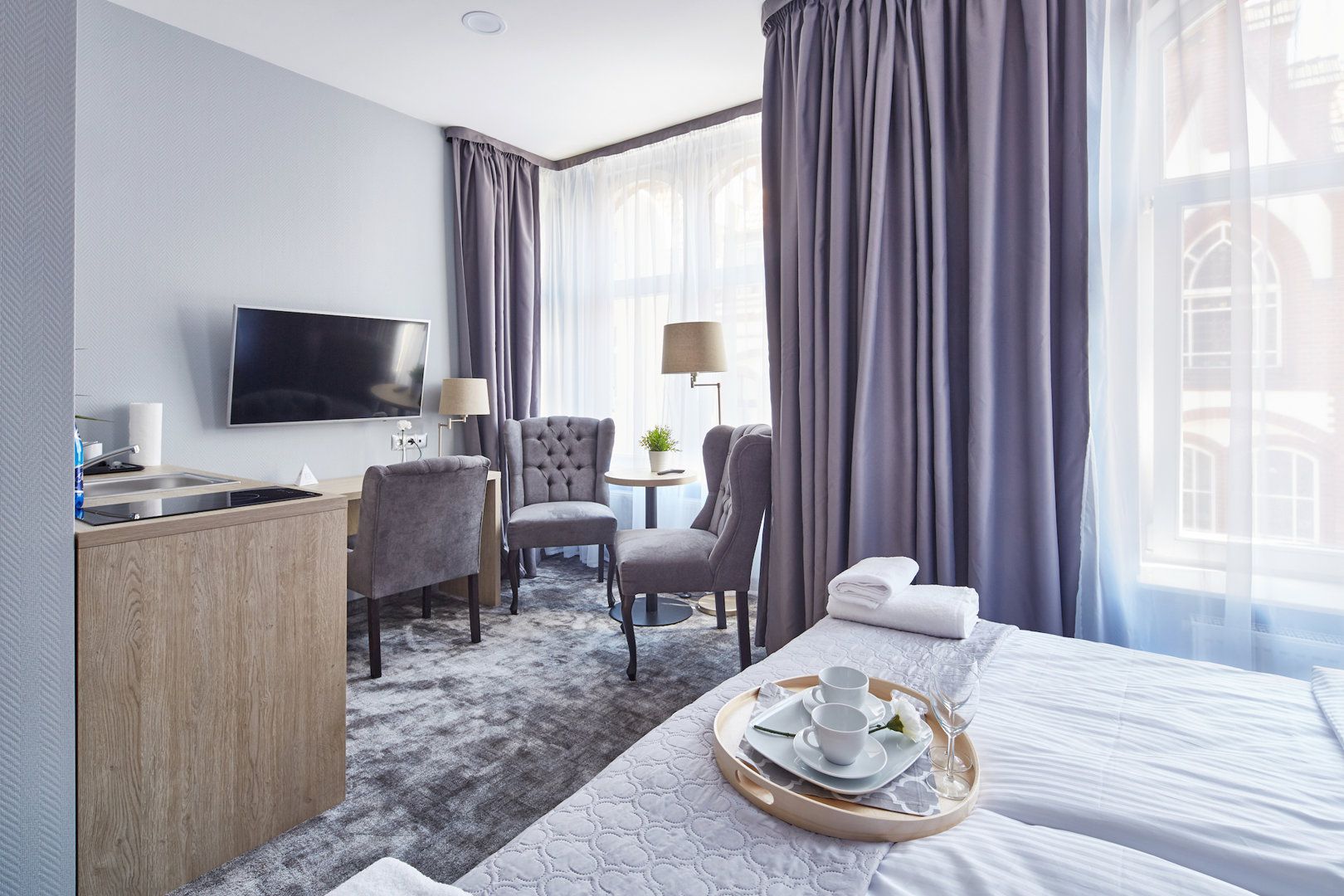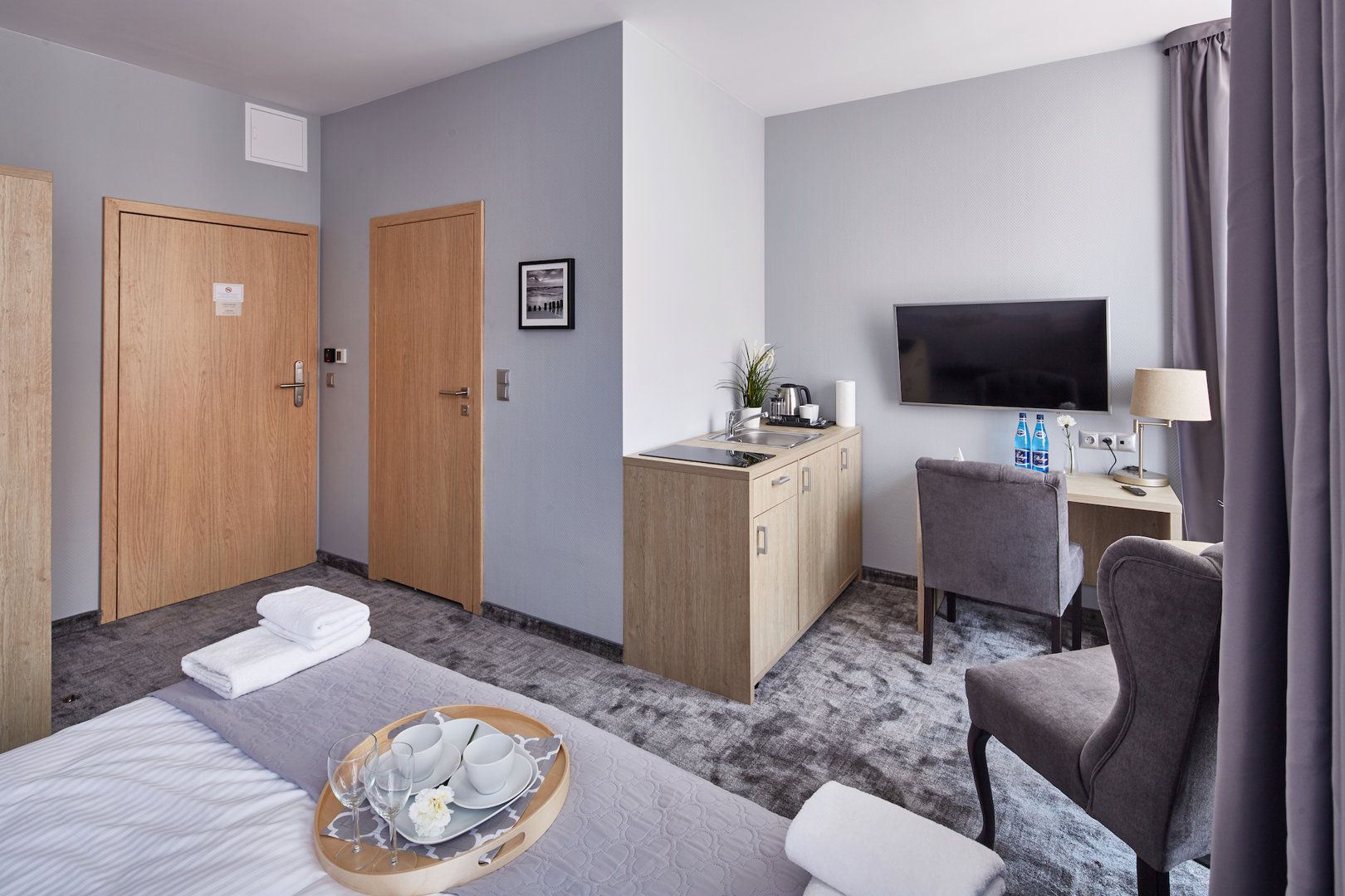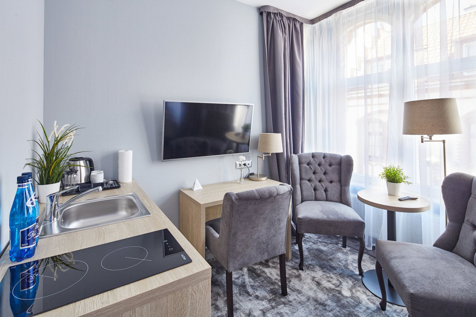 Apartament znajduje się na drugim piętrze stylowej, zabytkowej kamienicy. Na gości czeka jasny pokój z wygodnym łóżkiem małżeńskim, aneksem kuchennym oraz prywatną łazienką.