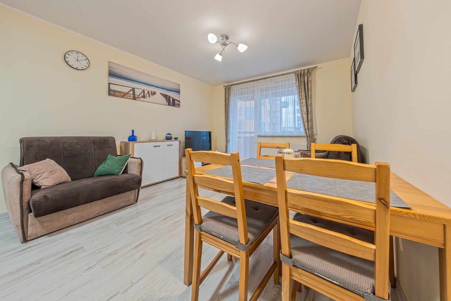 Przestronny salon z rozkładanymi sofami , telewizorem oraz stołem jadalnianym. To idealne miejsce do odpoczynku po dniu spędzonym nad morzem lub w mieście.