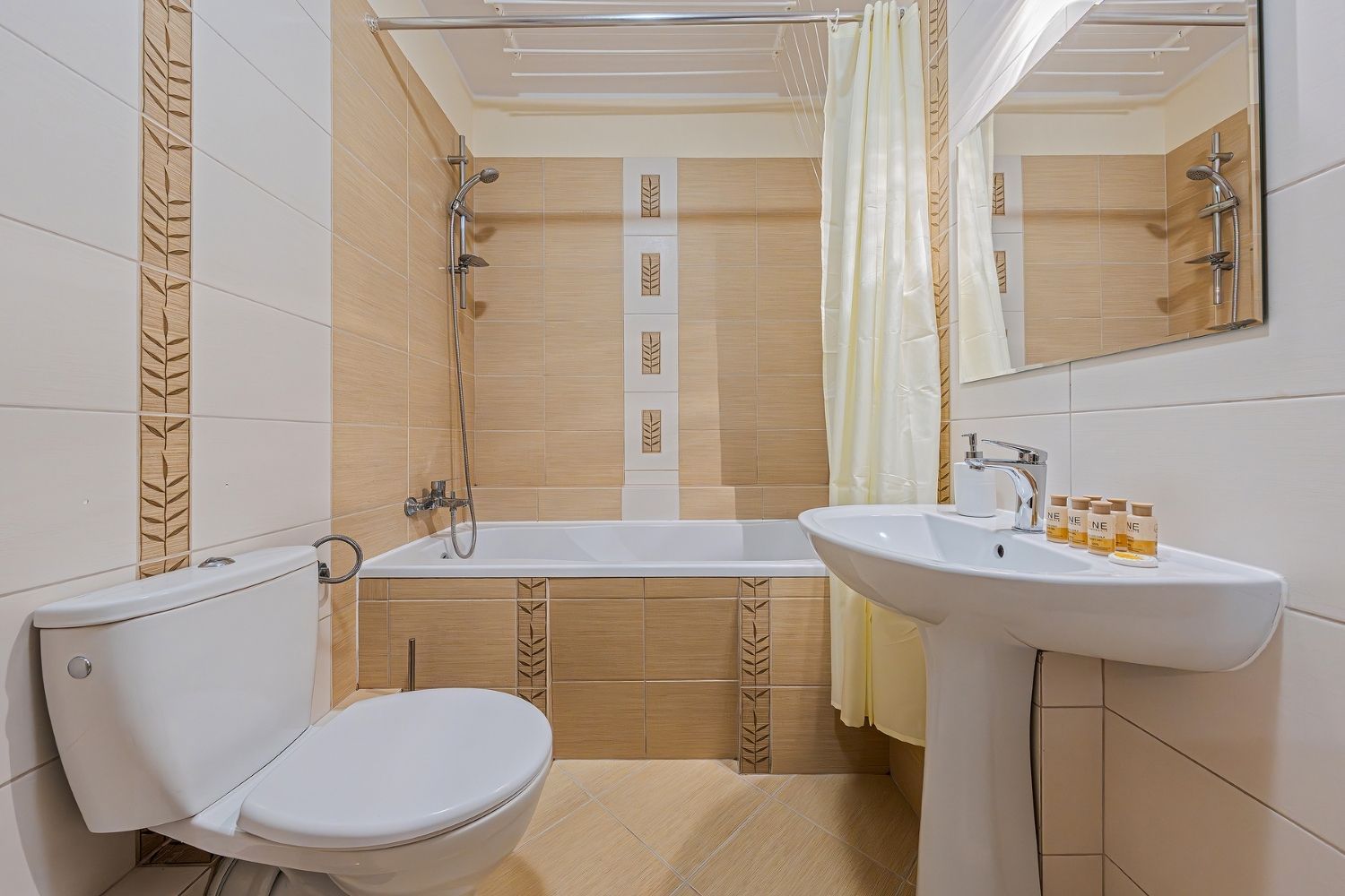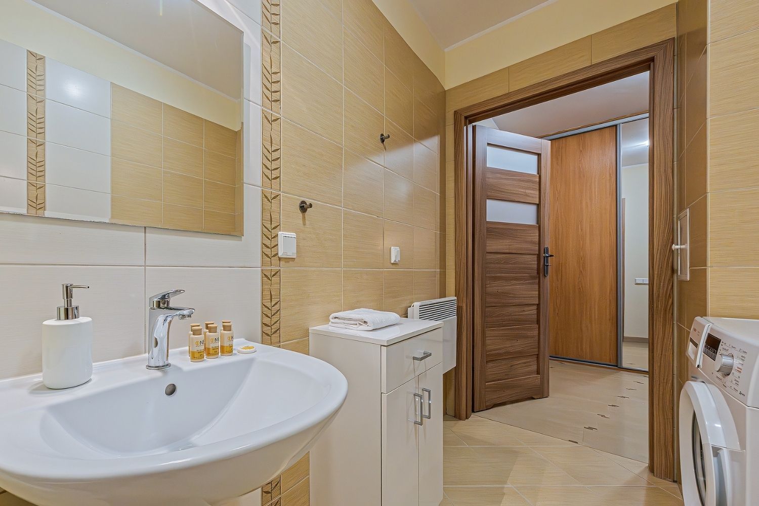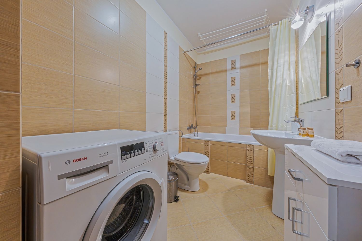 Elegancka łazienka z wanną i prysznicem, pralką oraz zestawem ręczników i podstawowych kosmetyków.