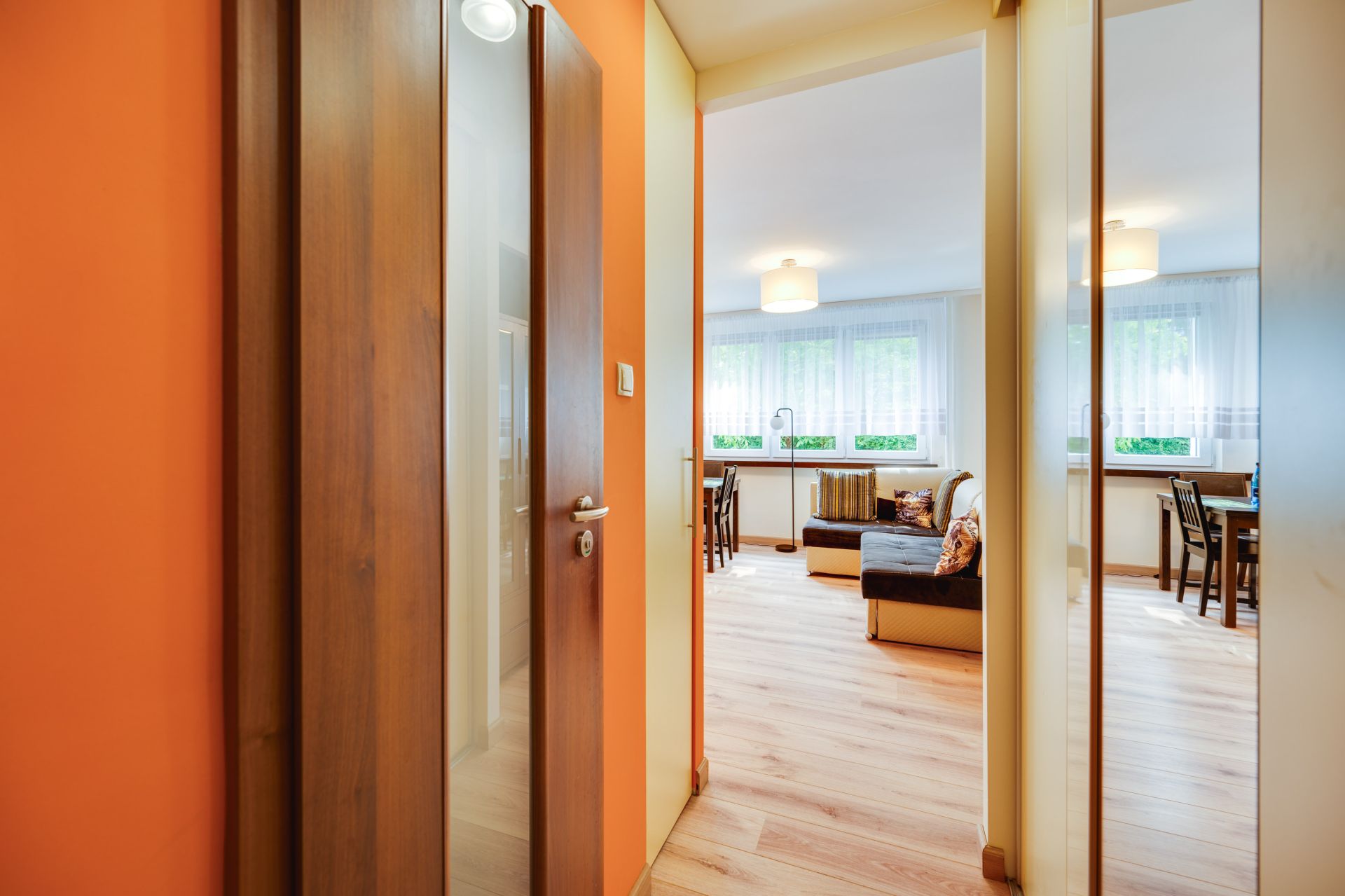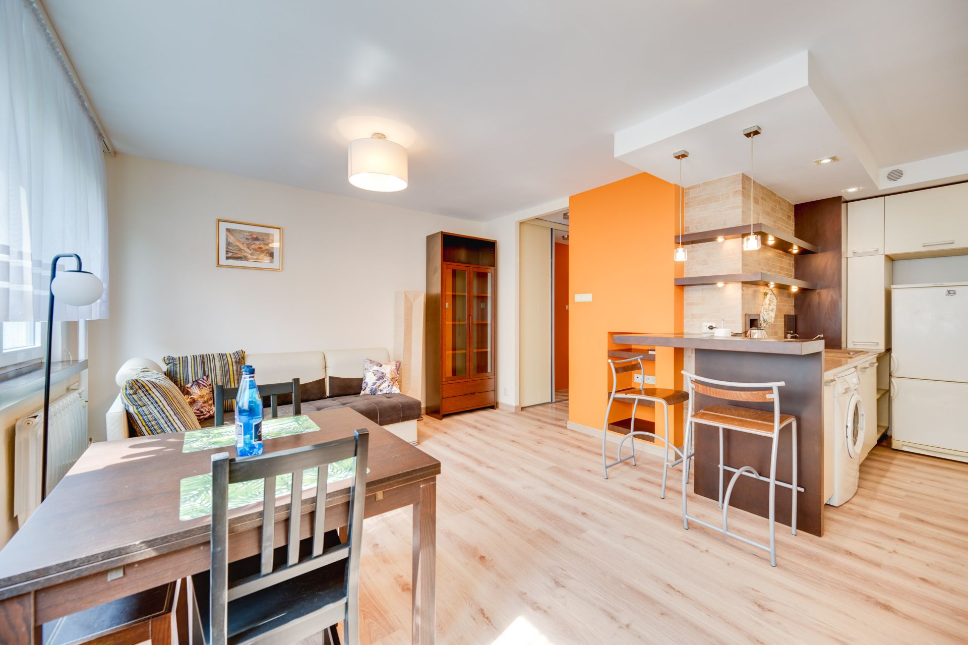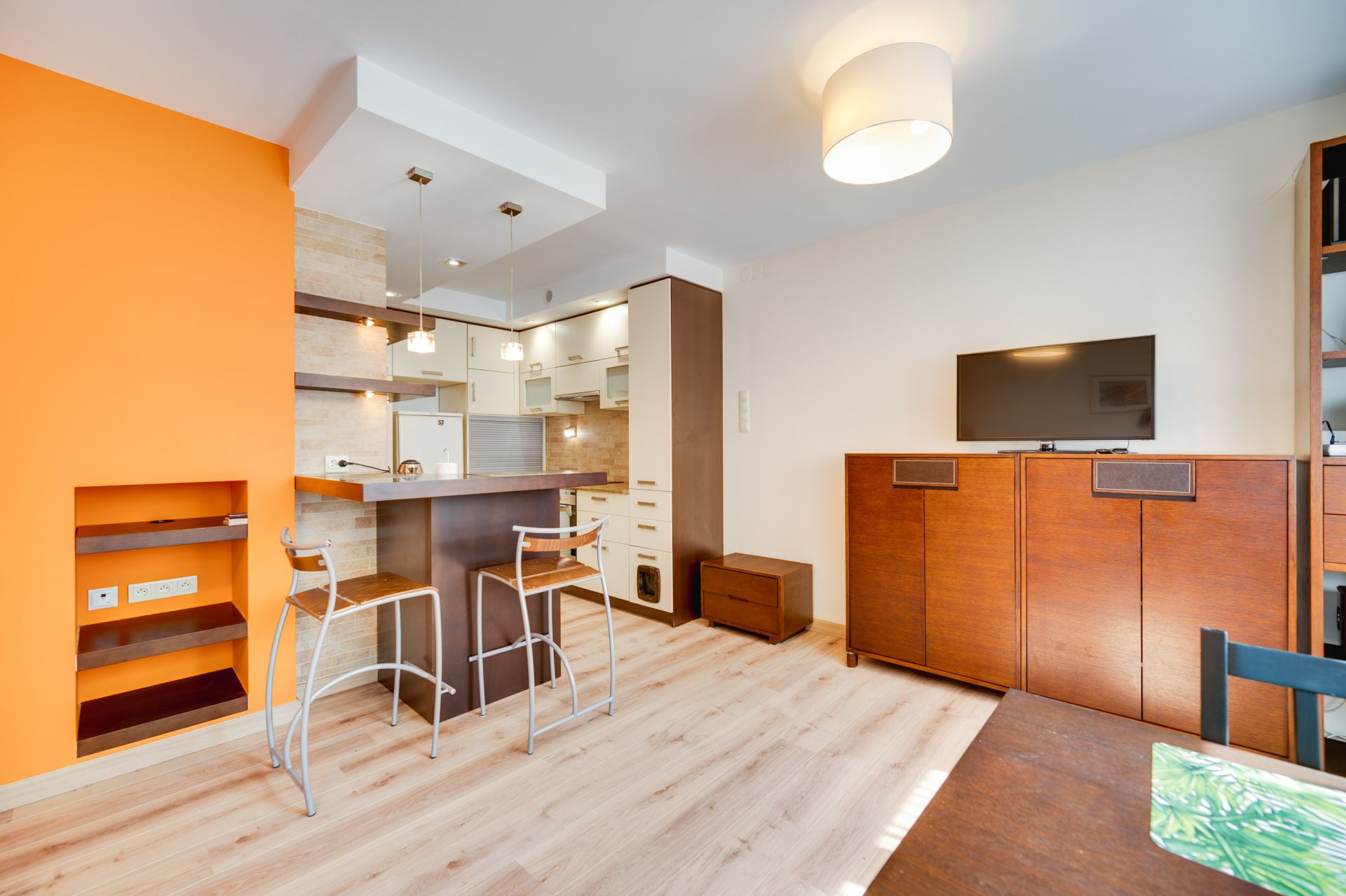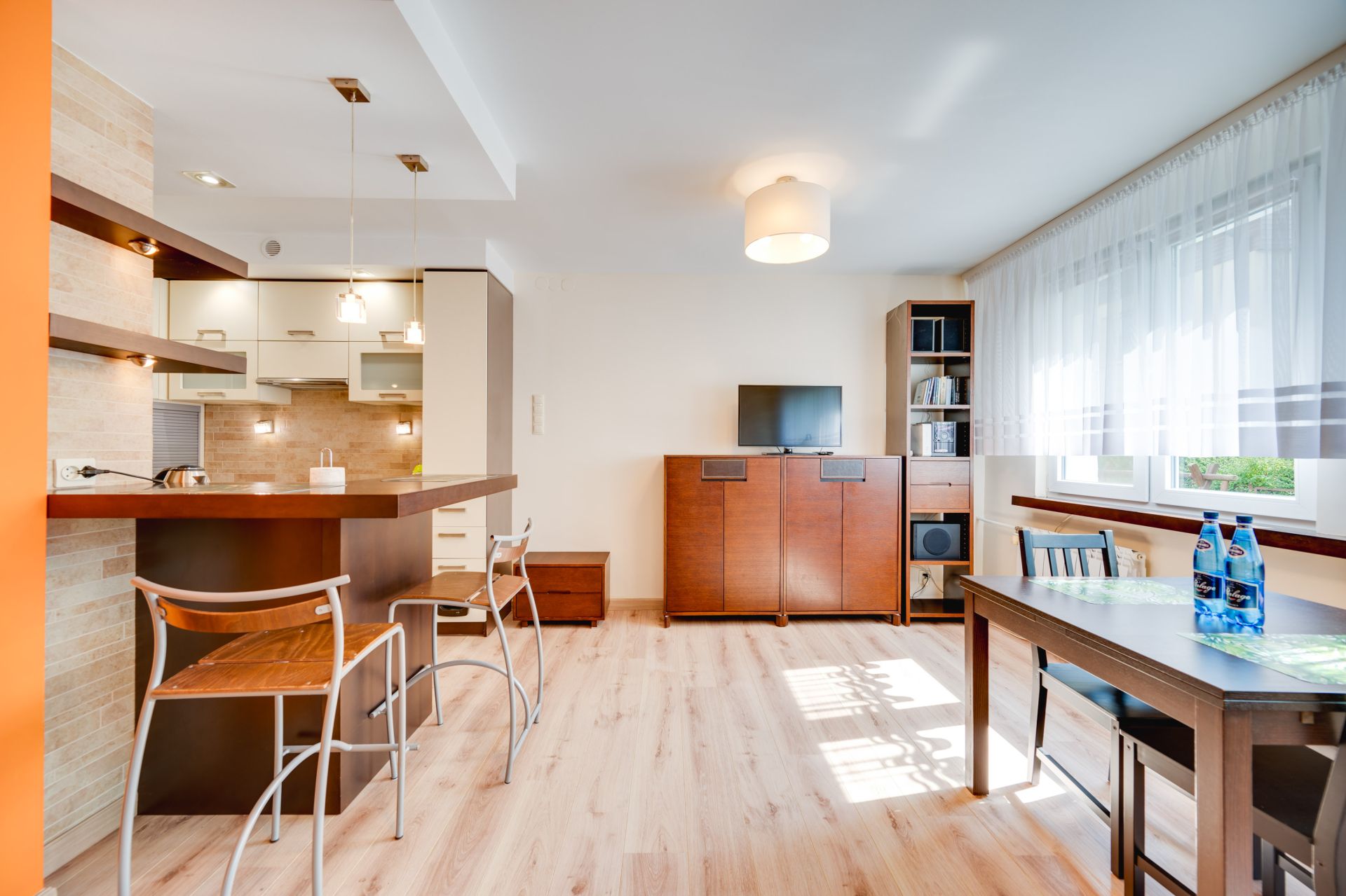 Orange to apartament przeznaczony dla dwóch osób. Składa się z przestronnego salonu, w którym znajduje się rozkładana sofa, aneksu kuchennego wyposażonego we wszystkie niezbędne urządzenia oraz łazienki. Na osiedlu nie ma możliwości zaparkowania na wyznaczonych miejscach.