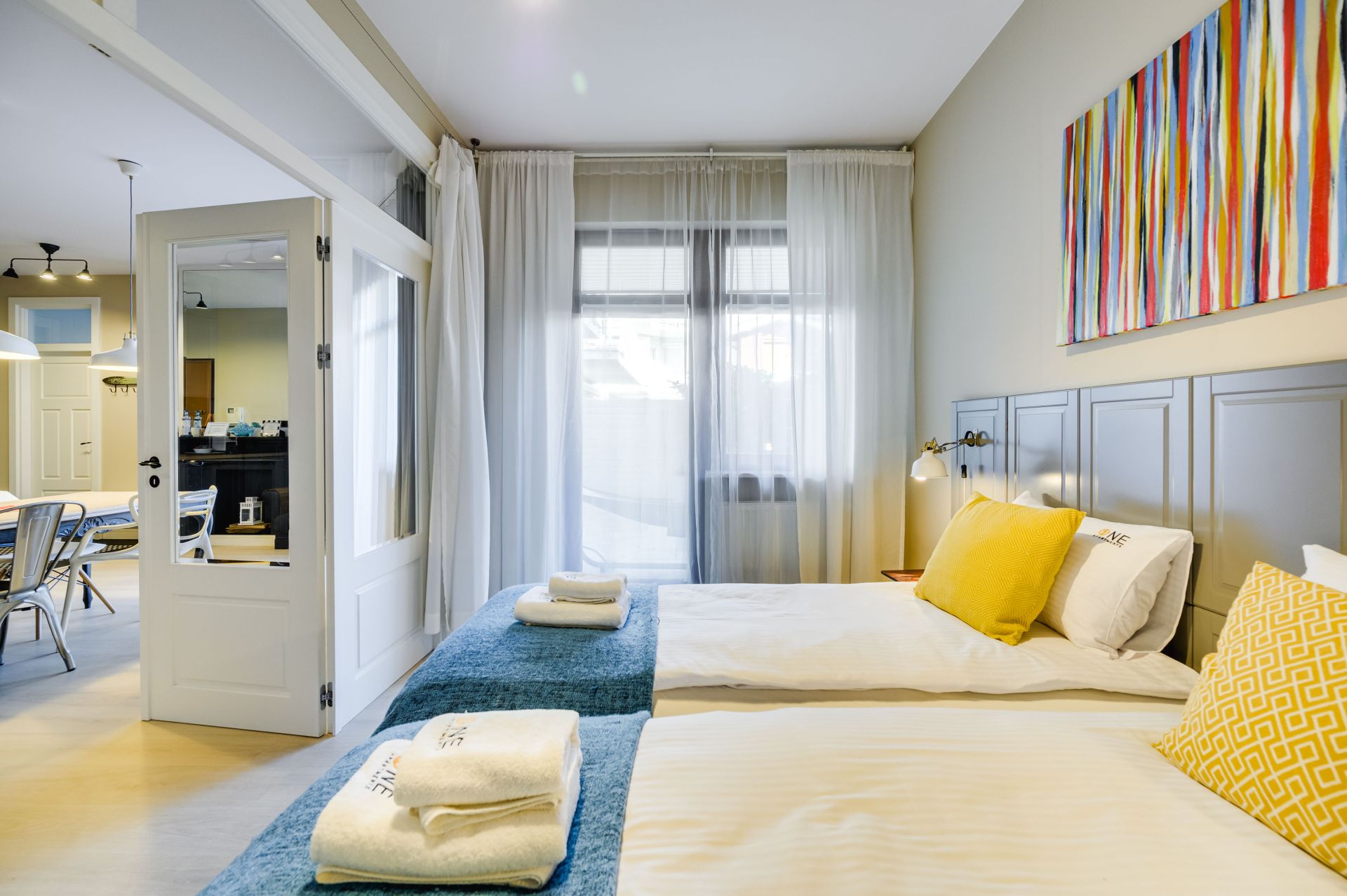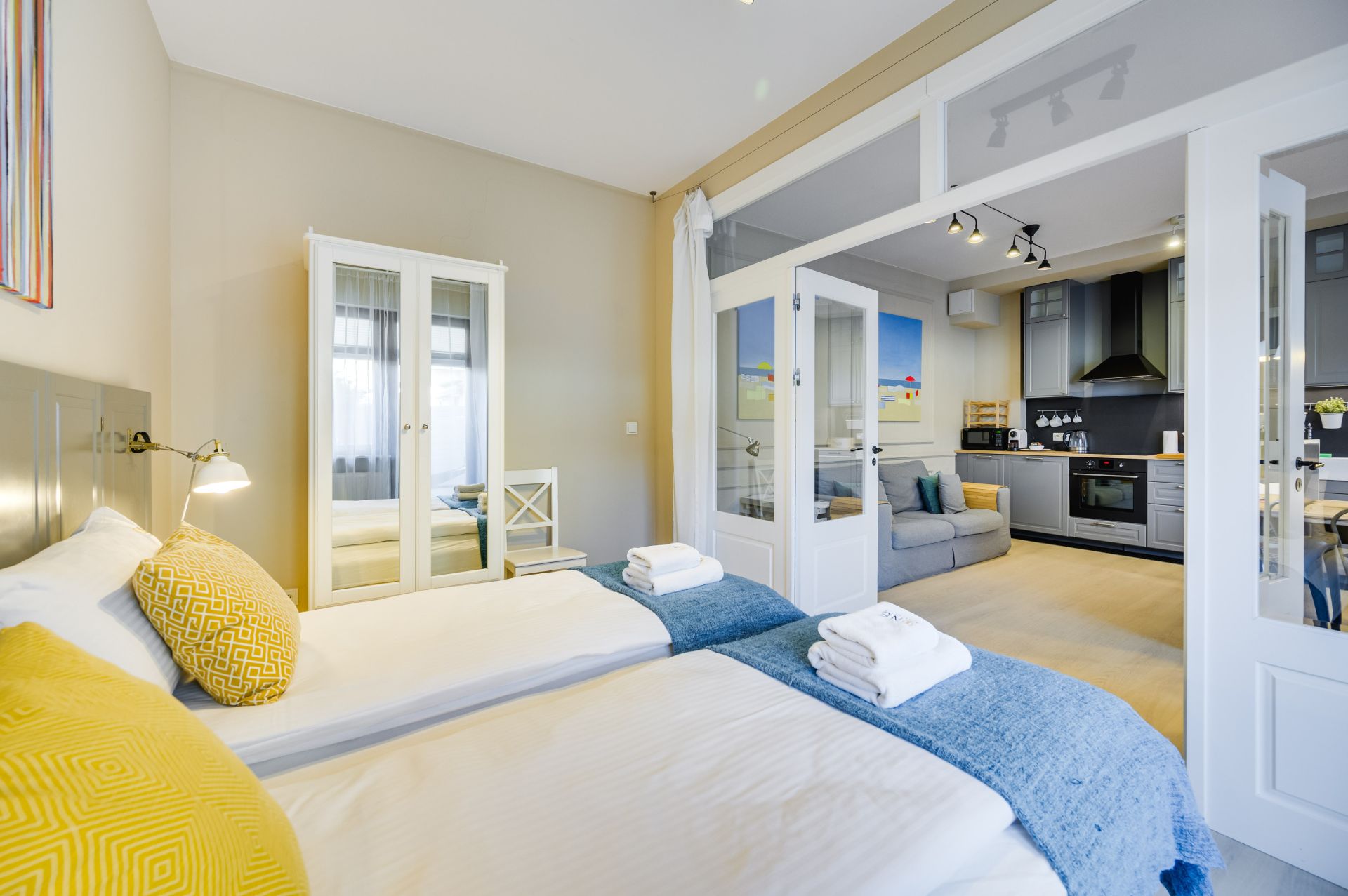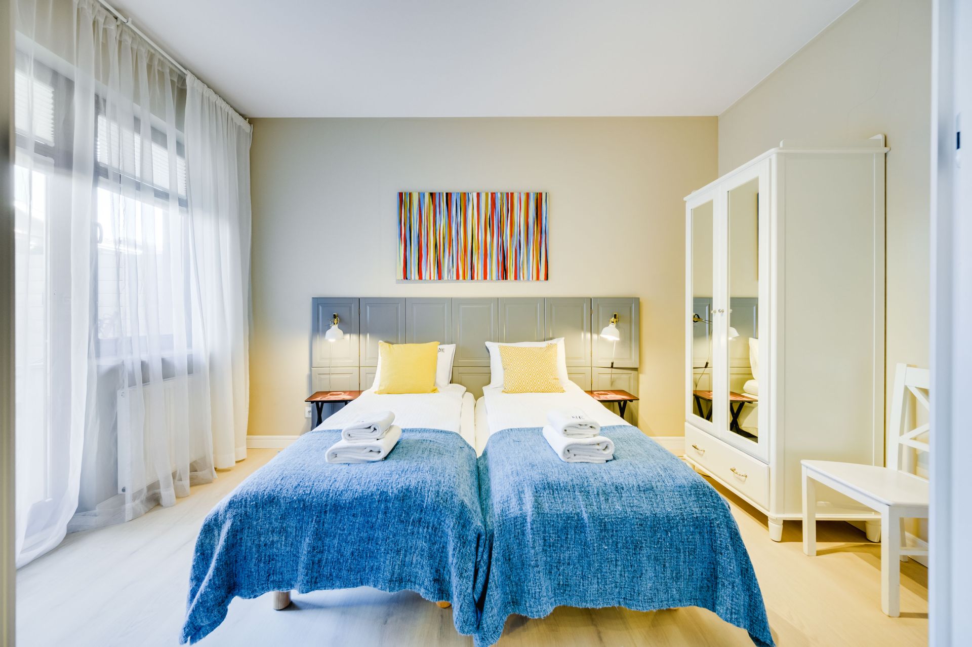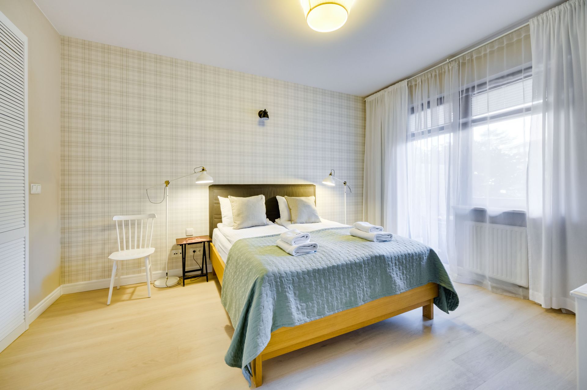 Sunny terrace to apartament 6 osobowy o powierzchni 71 m2. Składa się z salonu z aneksem kuchennym, sypialni z łóżkiem małżeńskim, sypialni z łazienką oraz kolejnej łazienki z prysznicem. W salonie umieszczona jest rozkładana sofa. Ze względu na taras apartament znajduje się na parterze. W obiekcie mogą przebywać zwierzęta za dodatkową opłatą. Zaparkować można na miejscach parkingowych na osiedlu, w hali gharażowej.